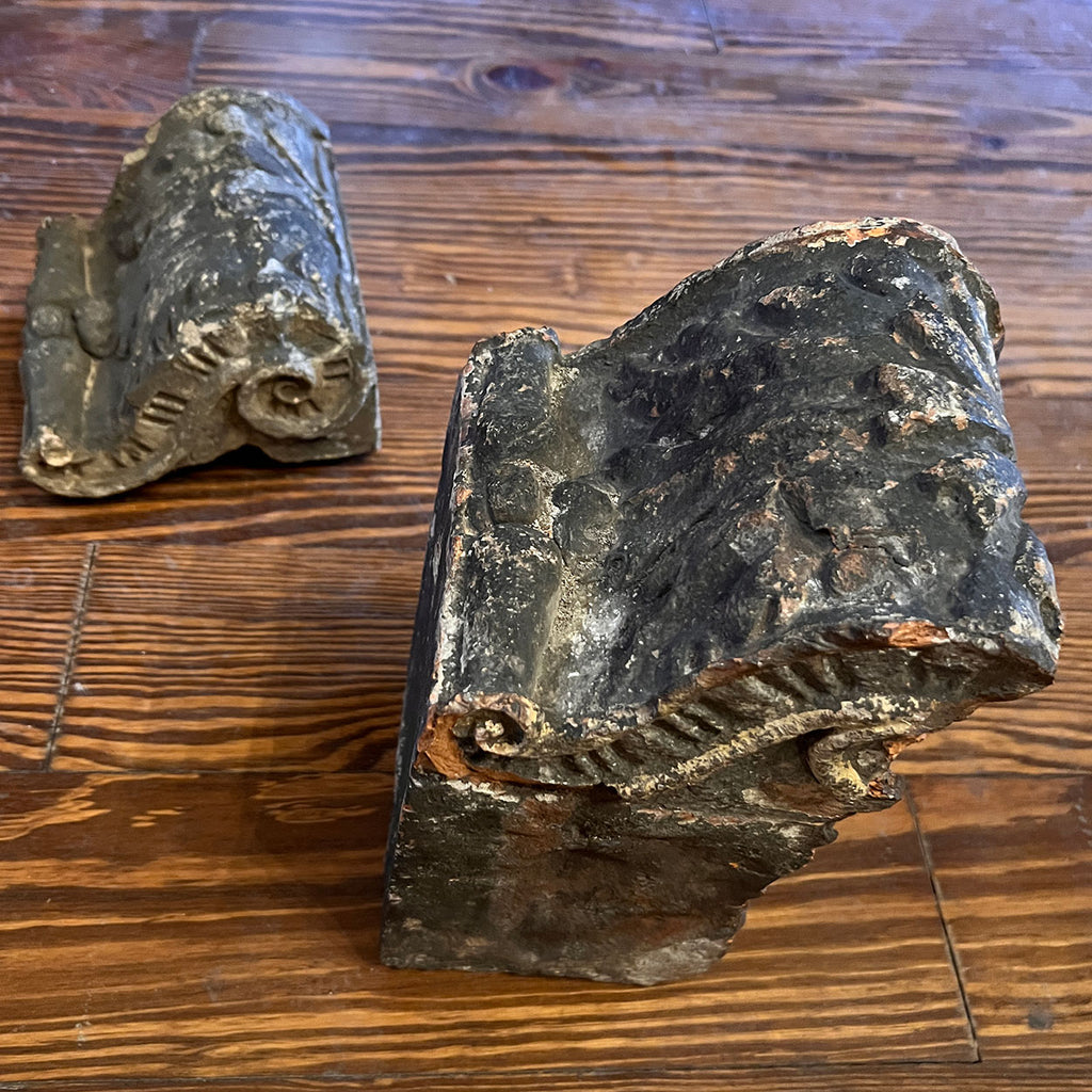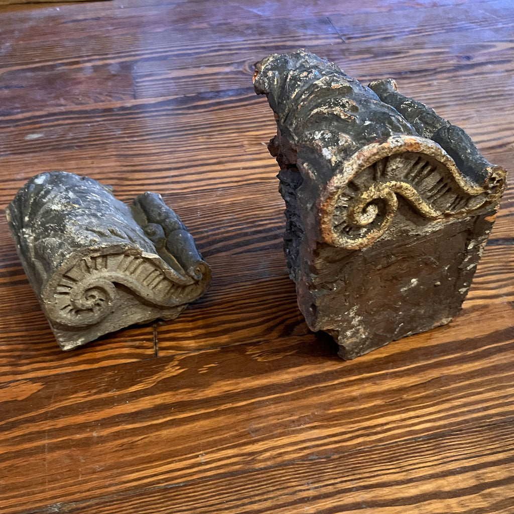 A set of two early English antique brackets with acanthus and scrolled decoration. Probably from the facade of a building.