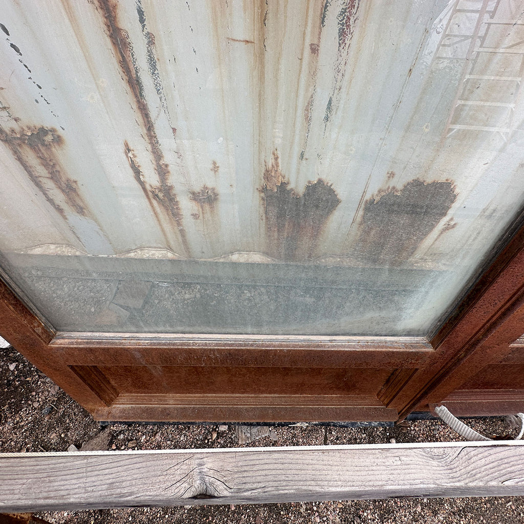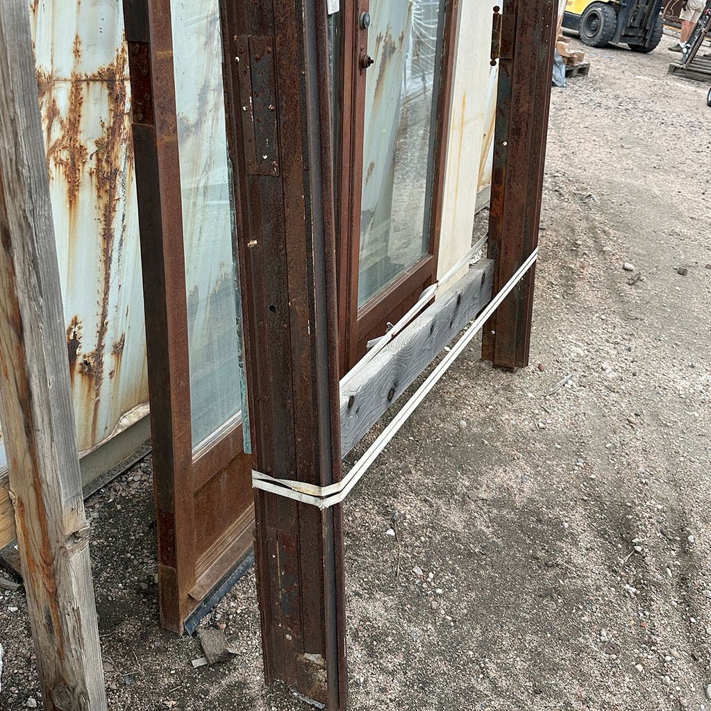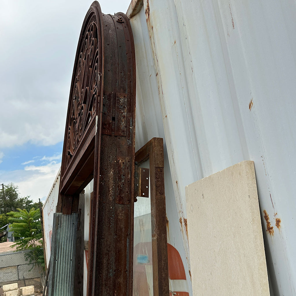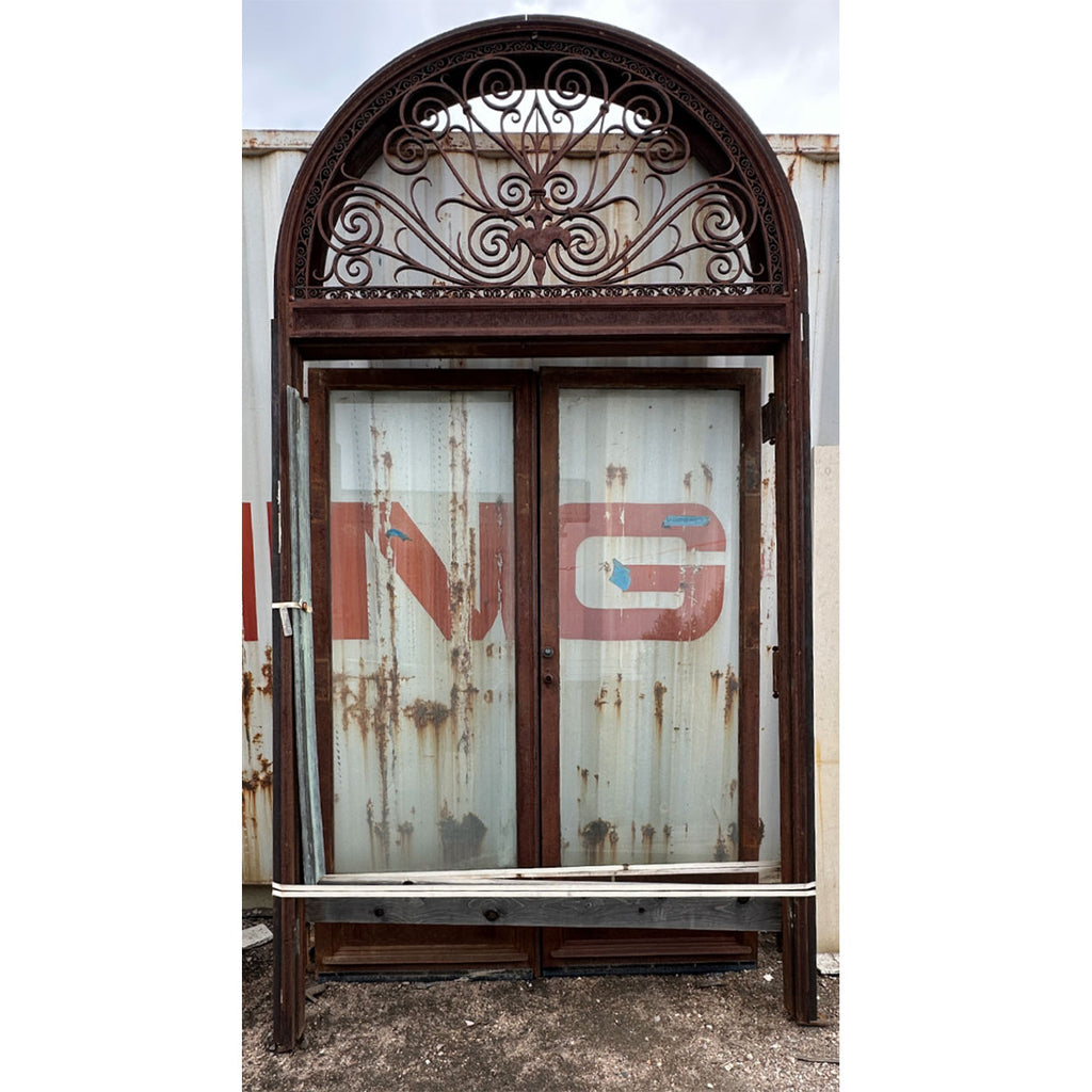 A large antique cast and wrought iron door entry salvaged from a grand historic Denver mansion. With brass threshold. Double sided ironwork. Originally it would have had a glass window.