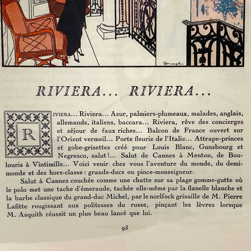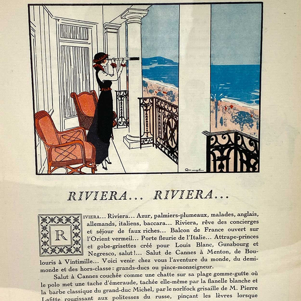 [A] Riviera...Riviera..., La Gazette Du Bon Ton.  A tongue-in-cheek view of fashionable life on the Riviera, authored by Michel George-Michel for Lucien Vogel’s popular Parisian fashion journal. Text in French.
