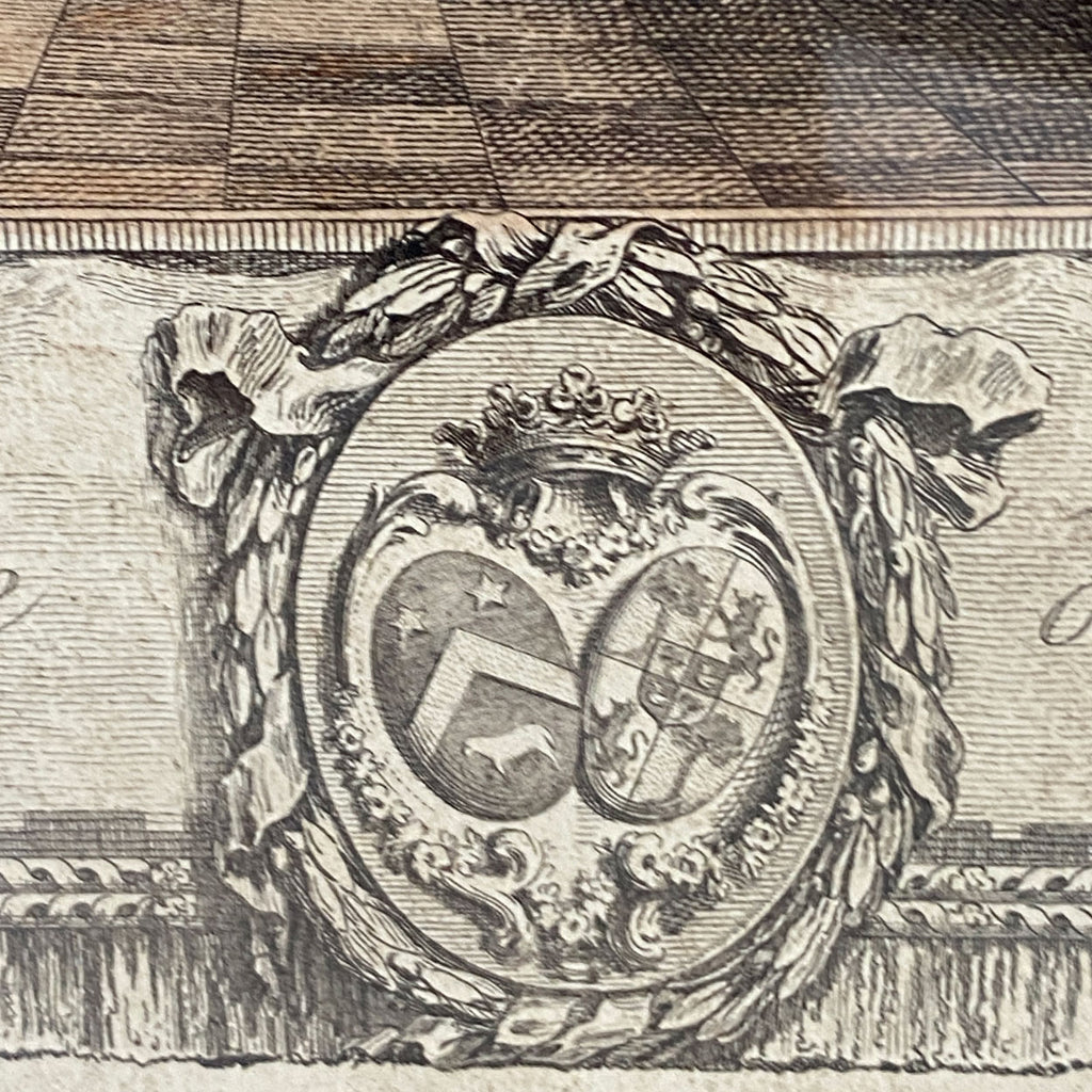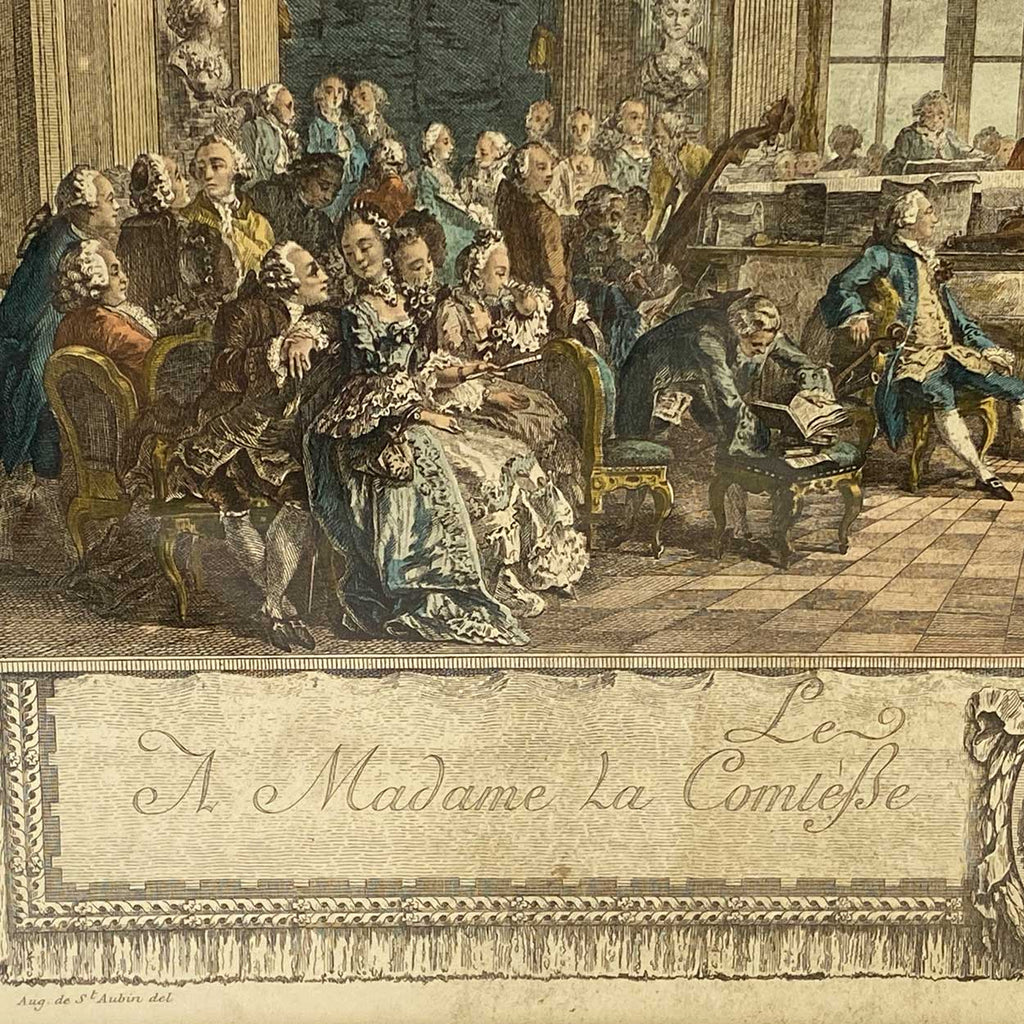 Based on a drawing by Augustin de Saint-Aubin that was exhibited in the Salon of 1773 (no. 291). Shows a group of musicians playing in a salon surrounded by an audience. In an ornamental trompe-l’oeil frame with a dedication and a coat of arms.