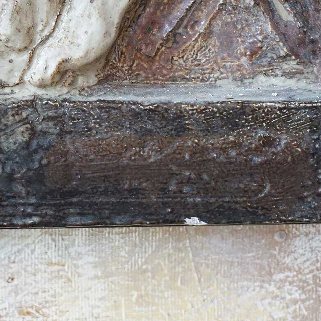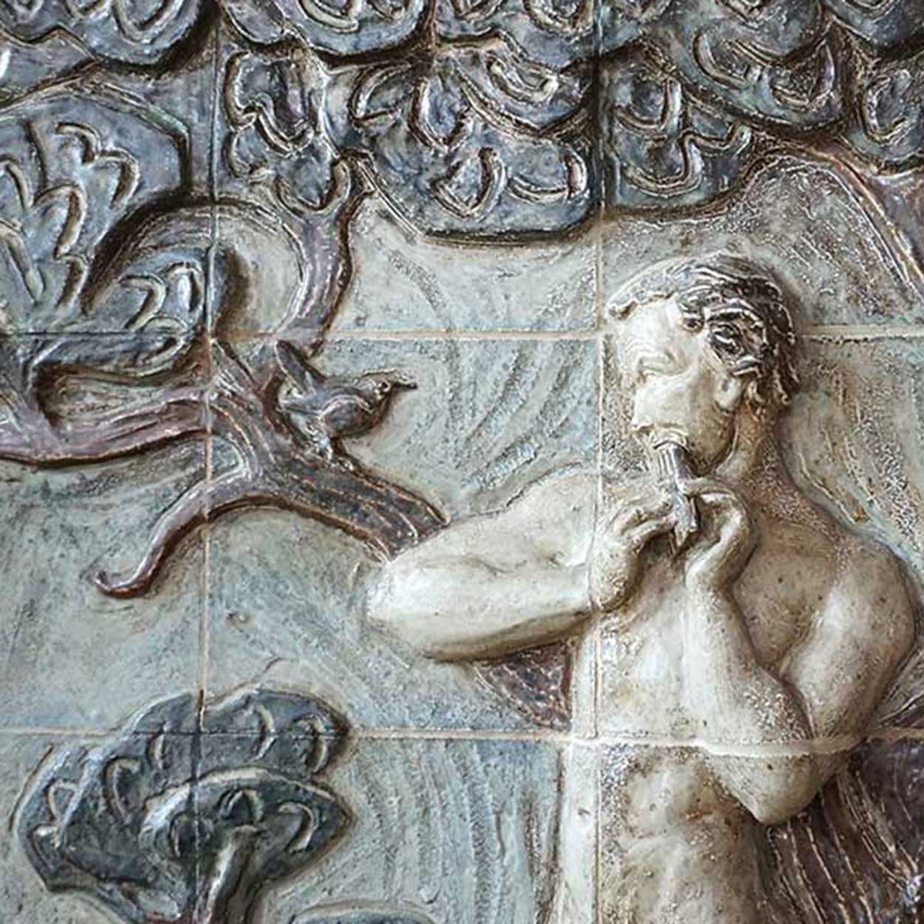 These very large, framed vintage tile scenes feature raised relief, moulded panels depicting the garden of Eden, with Adam and Eve each next to a tree with deer and birds. They make a stunning and very dramatic art statement.