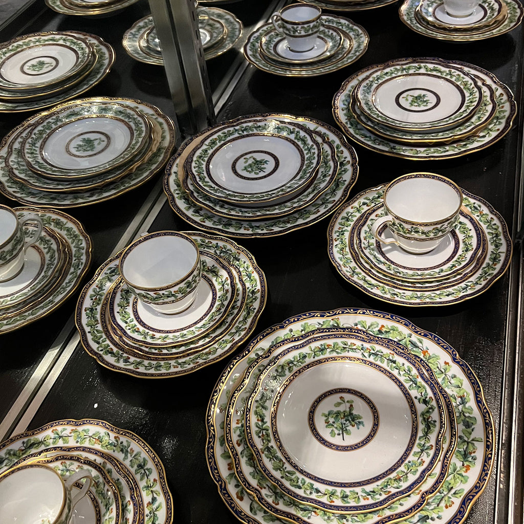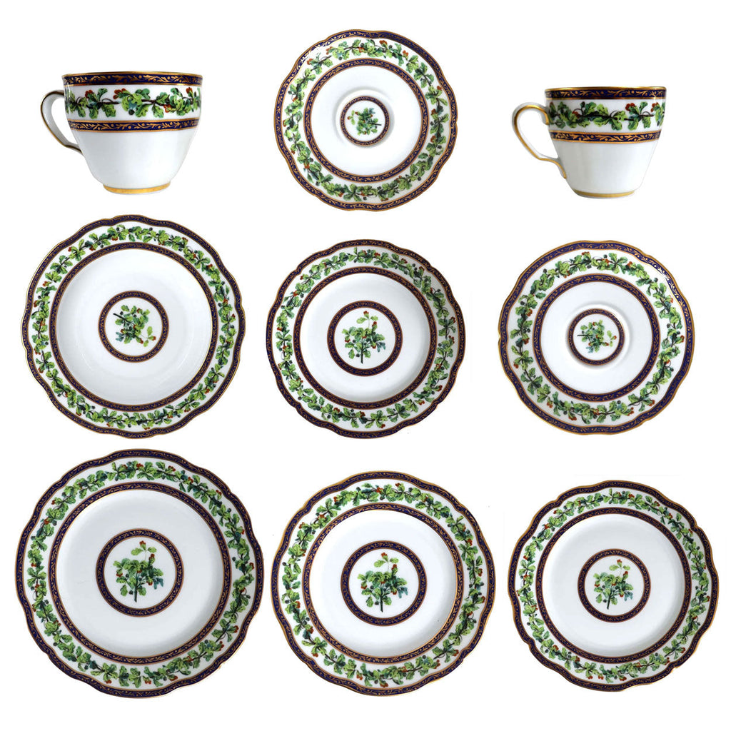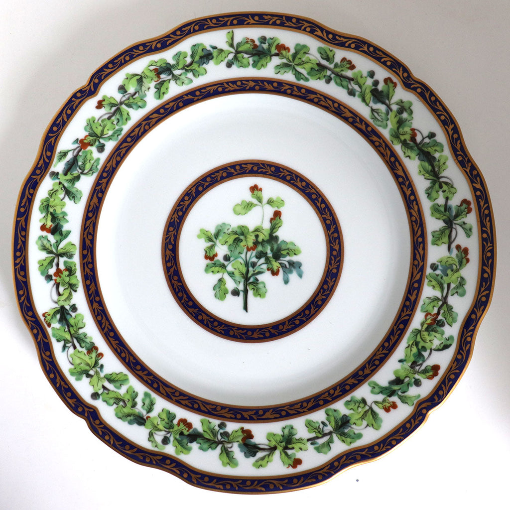 Modelled after an 18th century dinnerware pattern, Chêne Royal features a scalloped edge, decorated with red berry and green oak leaves bordered by dark cobalt blue banding embellished with gilt. A rare pattern, it is no longer in production. Note: price is for (1) dinner plate.