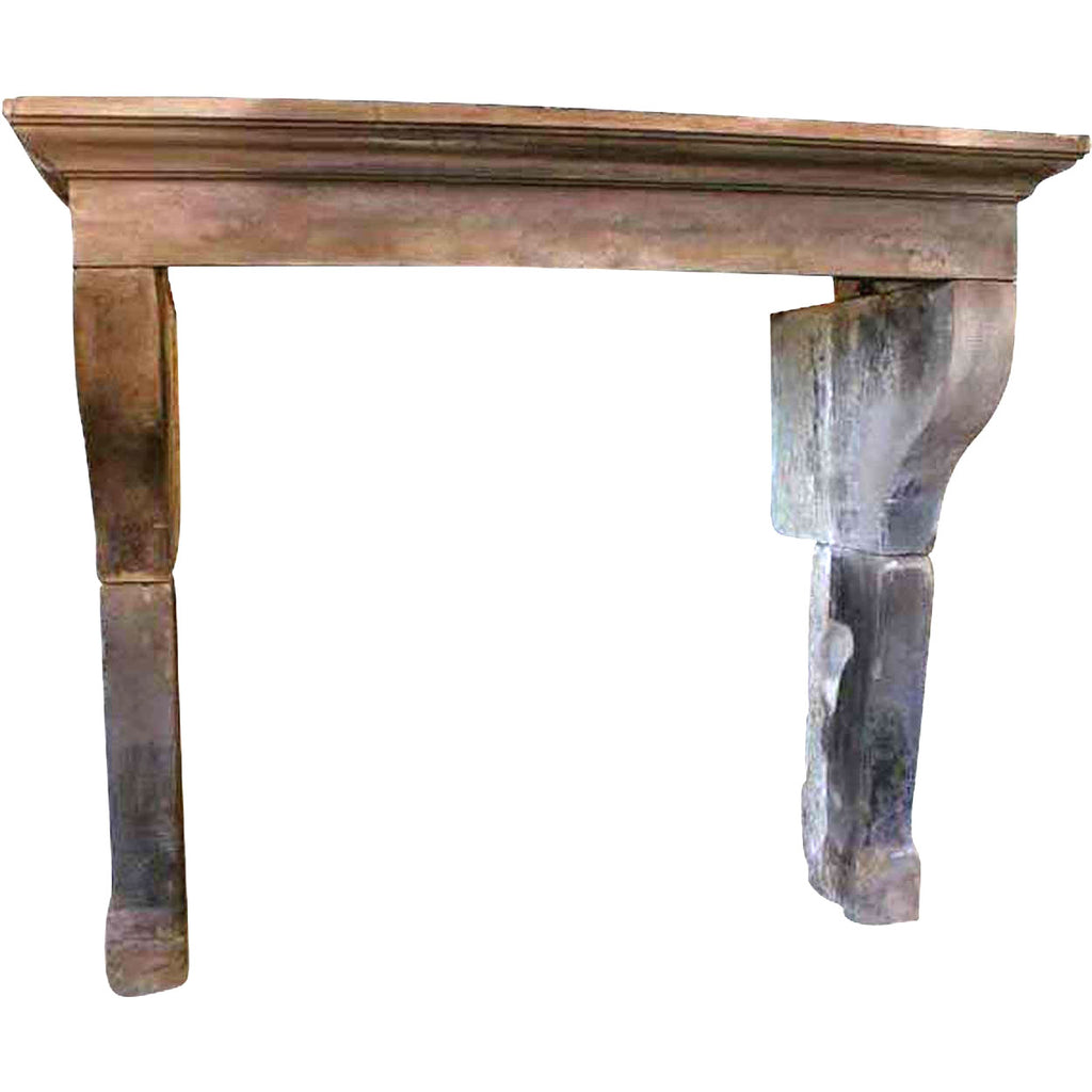 Hand fashioned of huge slabs of stone, this wonderful antique fireplace has a deeply moulded mantel overhangs an absolutely plain frieze that is supported by uprights that scroll back forming straight legs with small block feet. The large firebox lends itself to fabulous fires; a true inglenook. It is the type of piece perfect for a Great Room.