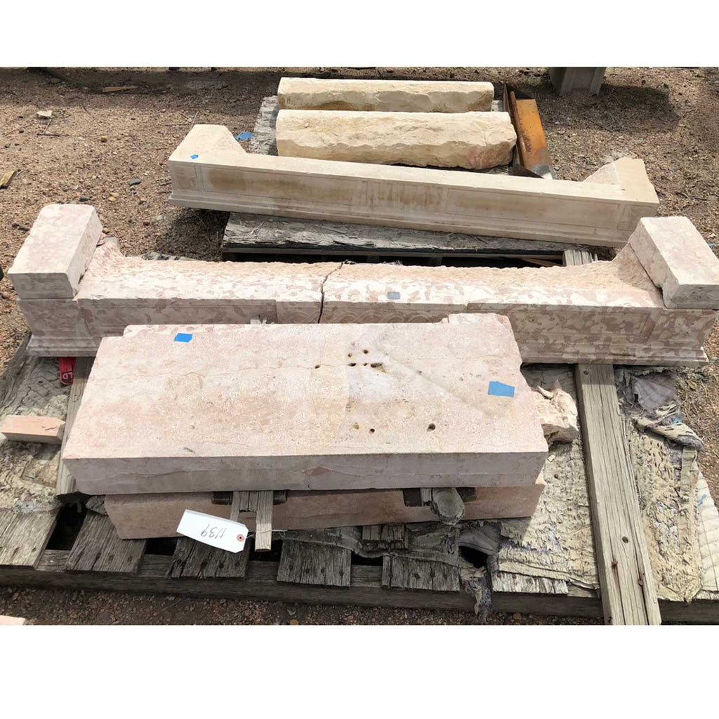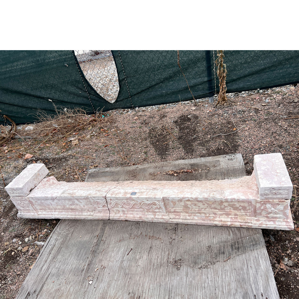 An antique fireplace with rosette corner blocks and guilloche centre block crafted in pale pink mottled Pierre de Bourguignon, Burgundy Stone which resembles marble.