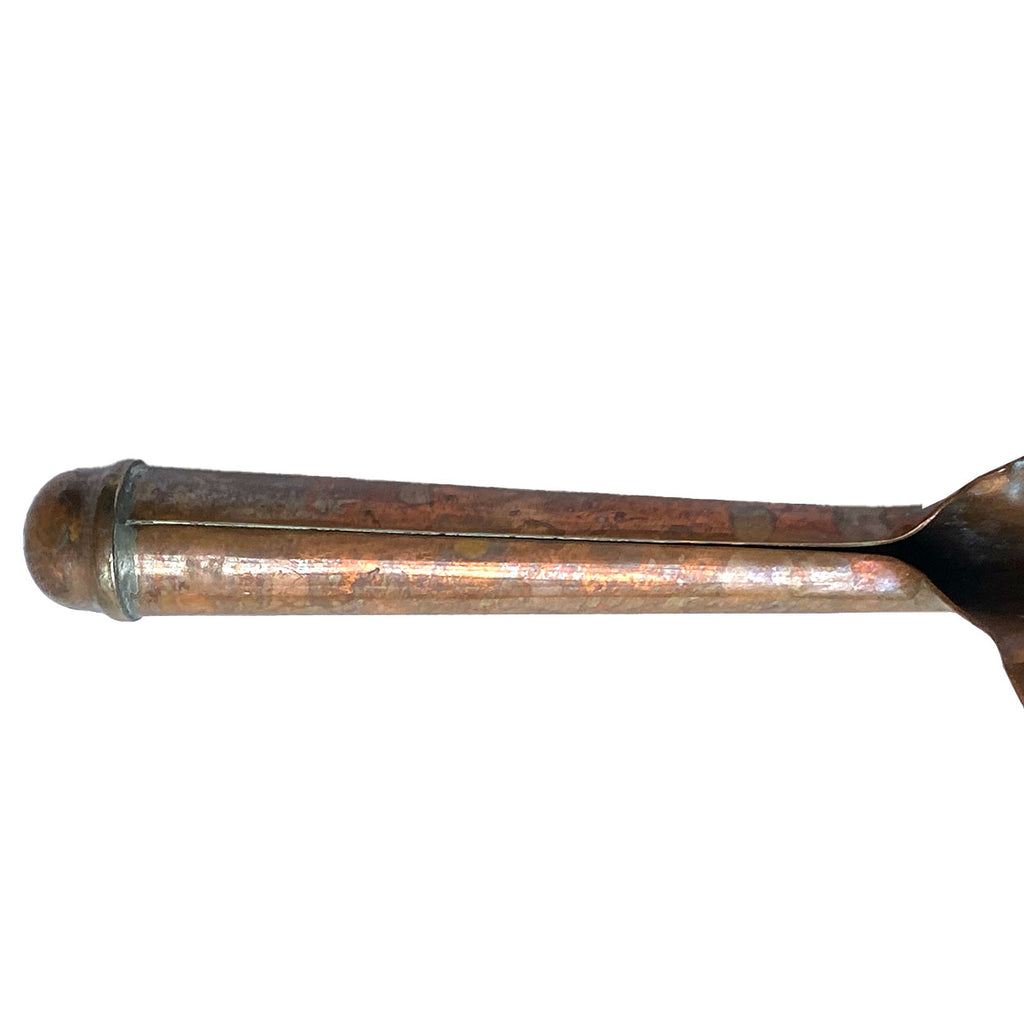 [A] An antique British Art Nouveau repousse and hammered copper dinner table, long-handled crumb scoop.