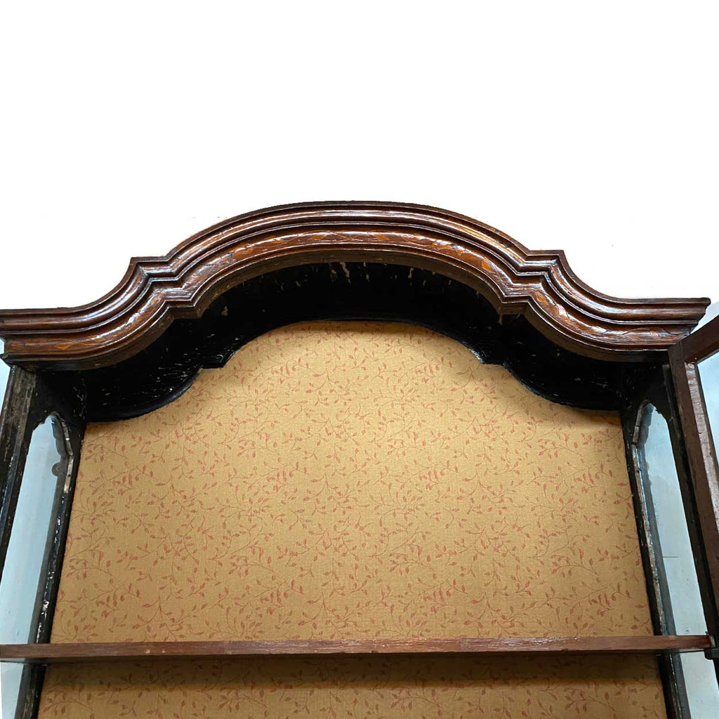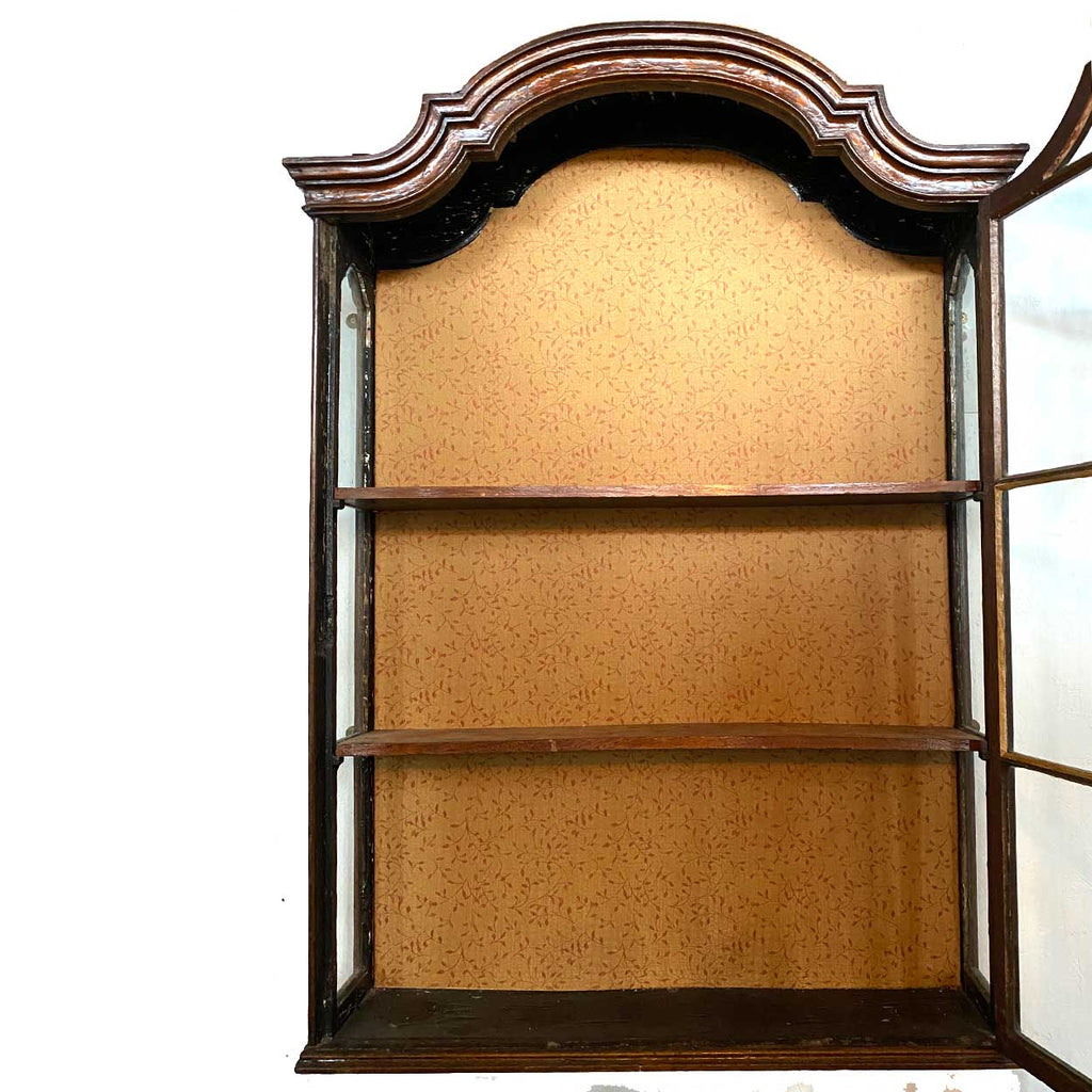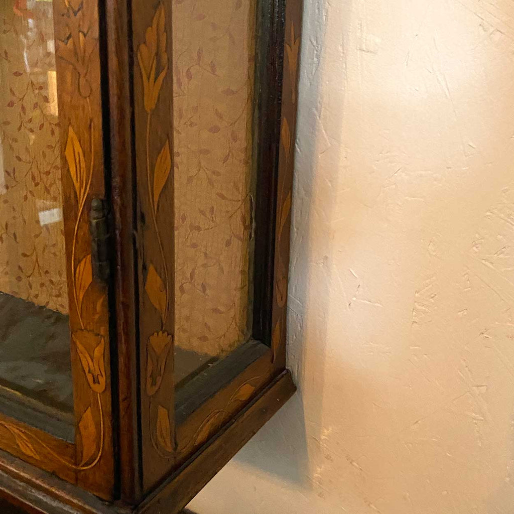 An antique Dutch hanging vitrine display or wall mount curio cabinet. The case with arched and shaped cornice in walnut and oak inlaid with undulating floral vine decoration. The case with a leaded astragal glazed single front door and sides; the interior with three lined display shelves. Brass hardware.