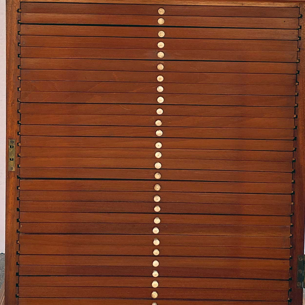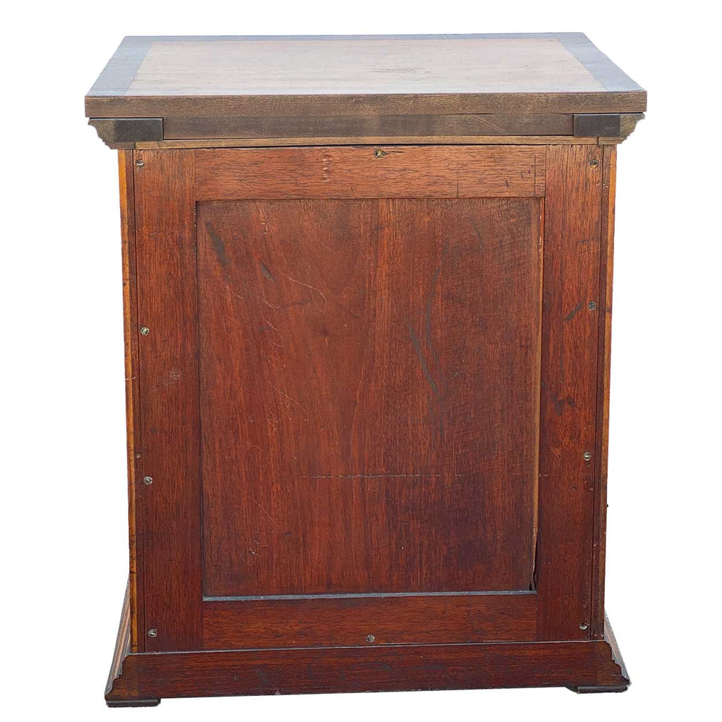 A small, antique, table-top collector's cabinet for scientific microscope specimen slides. The rectangular cabinet with overhanging flat top and molded base, on bracket feet. The single glass front cabinet door encloses 25 stacked, shallow slide drawers each with knob pulls.