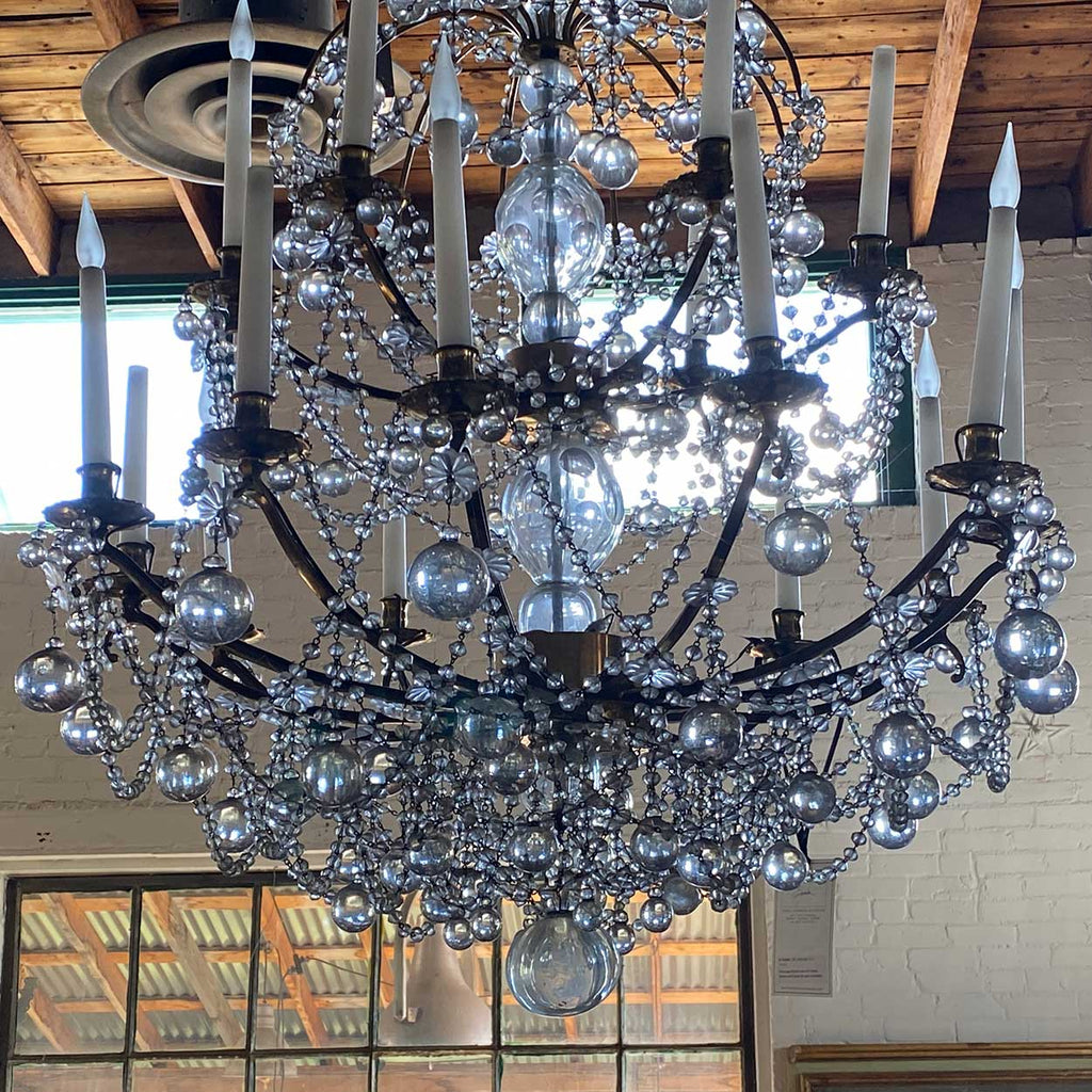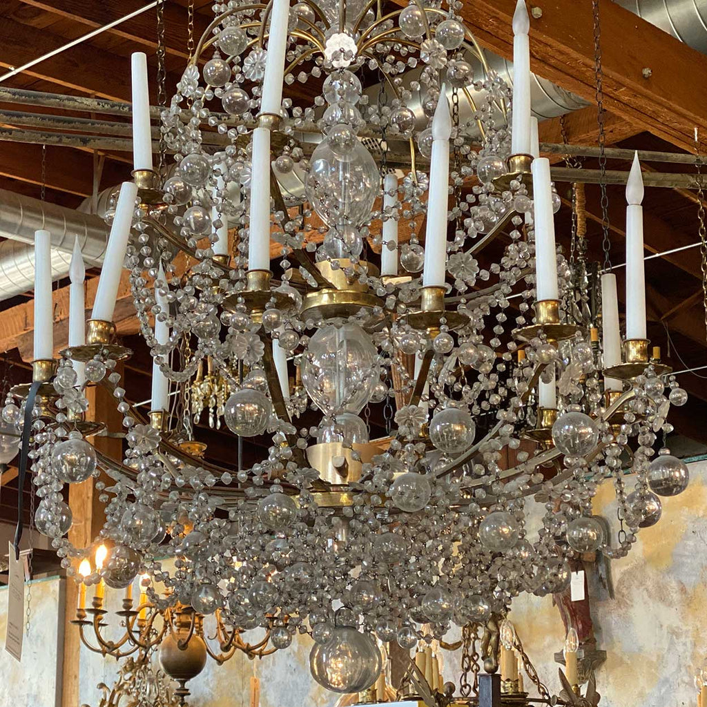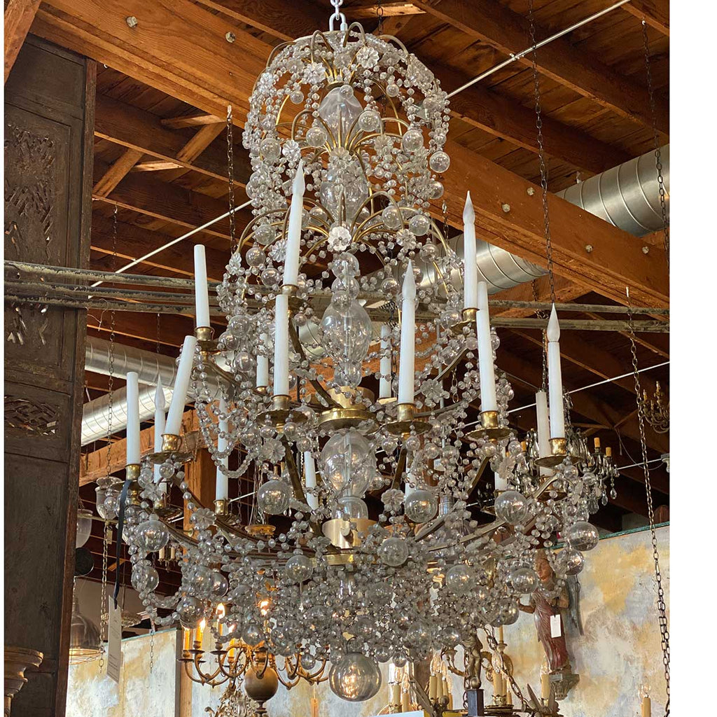 Rising on a central, crystal fount, this very large antique French chandelier features three upper tiers in umbrella shape in gilt bronze, with two lower tiers inverted and housing the lovely, tall and slender candle lights. This piece is special for the myriad round crystals of varied sizes, including a large, cut one at the bottom, and the elaborate beaded swags. It is of the highest quality; an impressive piece and nice, compact size. It was salvaged from a Paris building in the 1970s and is a rare surviving example of the elegance of the time.