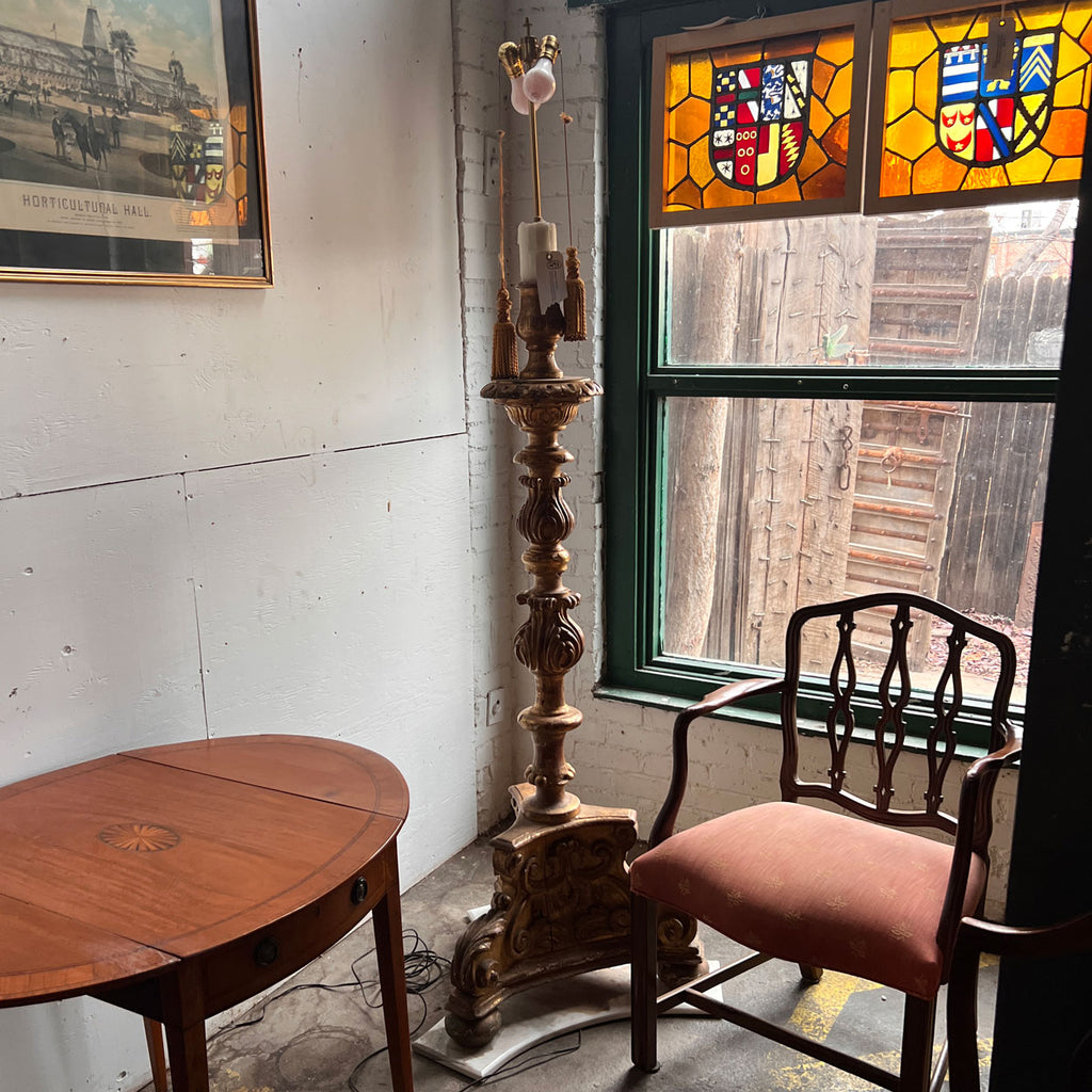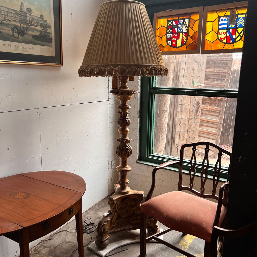 This magnificent, tall antique gold gilt lamp began life as an 18th century torchiere, but is now modified as an electrified floor lamp. It is of the finest quality, artistically designed, with an egg-and-dart border around the drip pan and rococo designed stem with scrolled, acanthus leaf details. It terminates on a triform base with scrolled acanthus leaf motifs on the broad surfaces, ending on ball feet. It will be a stunning addition to a special room.