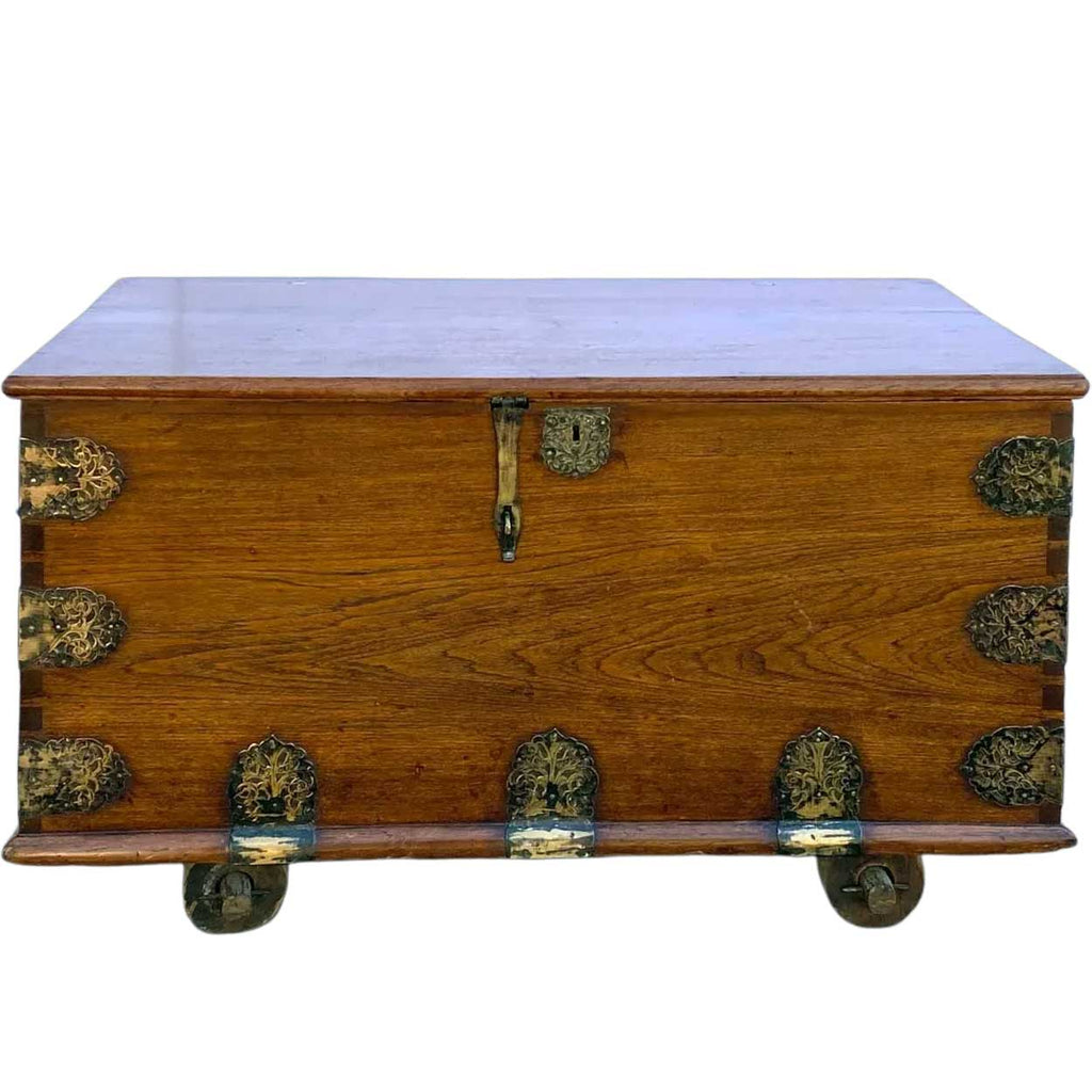 Indo-Portuguese Goan Brass Mounted Teak Storage Trunk on Wheels