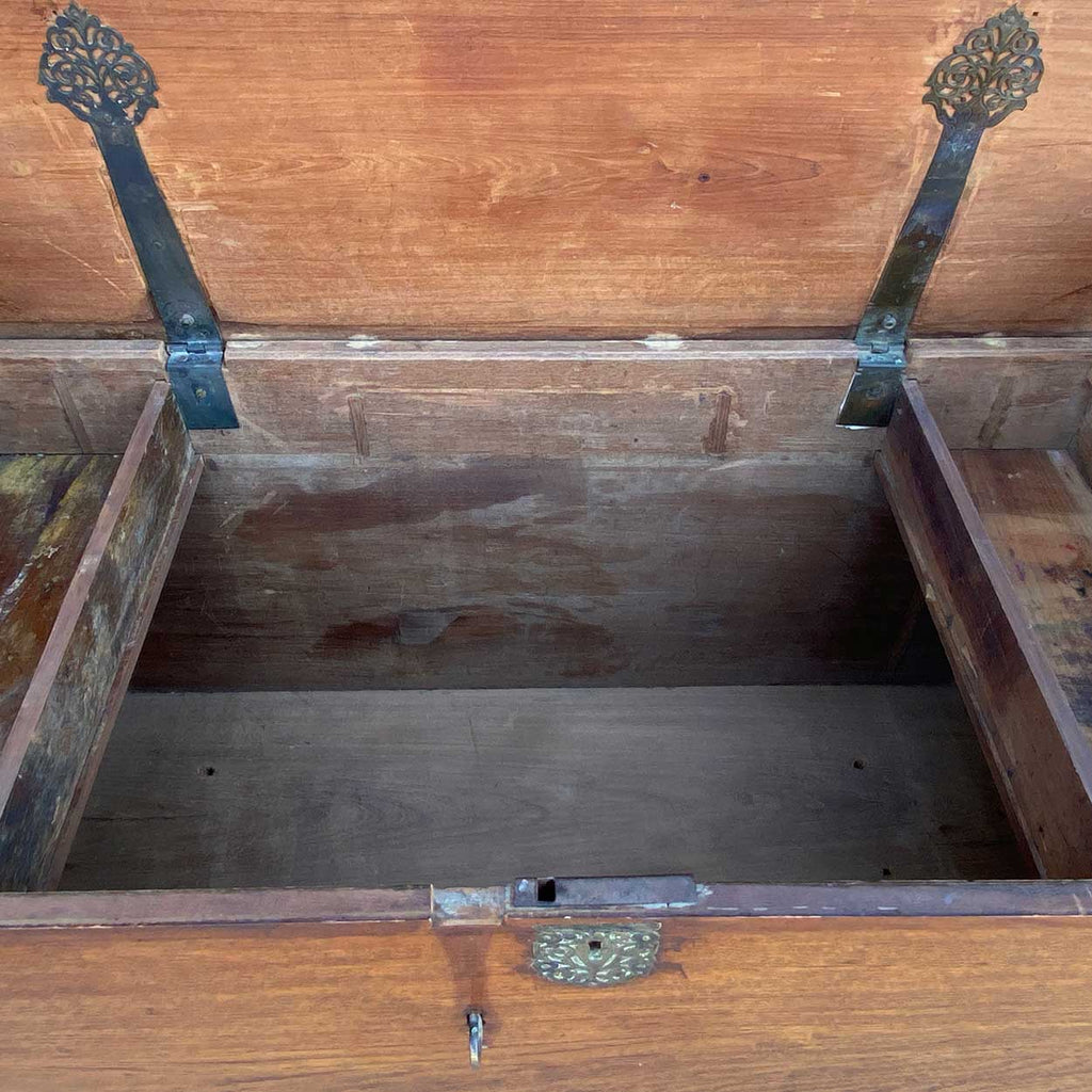 An antique teakwood coffer blanket chest of rectangular form with hinged lift top lid. The interior with two hinged candleboxes. With carrying handles.