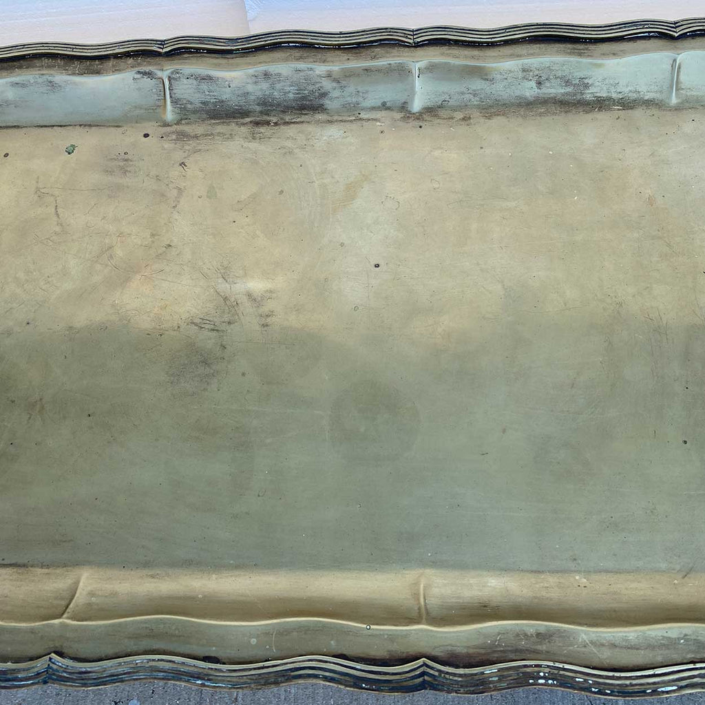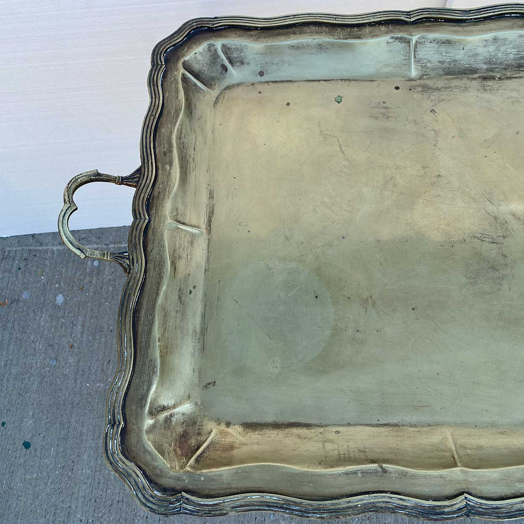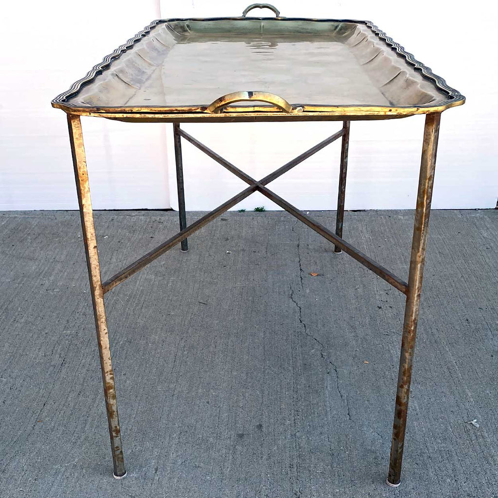A vintage tray table with a rectangular wrought iron base with straight legs joined by an X-stretcher. Supports a large rectangular alpaca metal (nickel silver) tray with serpentine reeded edge and side handles.