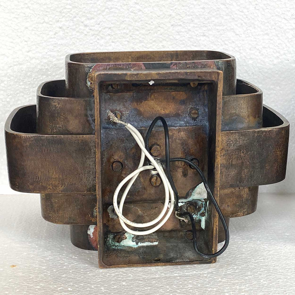 Pair of vintage patinated bronze modernist sconces designed by Jules Wabbes. Five graduated tiers of bands.