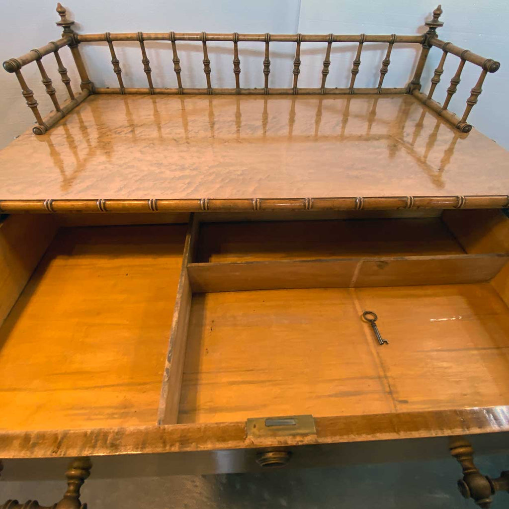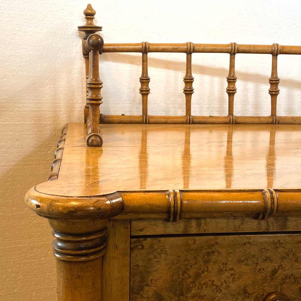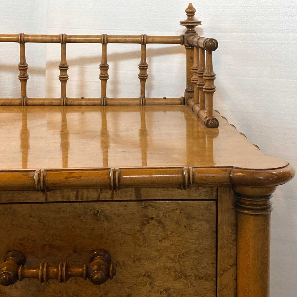 An antique Victorian period tall, chest of drawers in figured maple with faux bamboo details. With an open bamboo spindle gallery top over six full drawers, flanked by three-quarter columns. Paneled sides. With key.