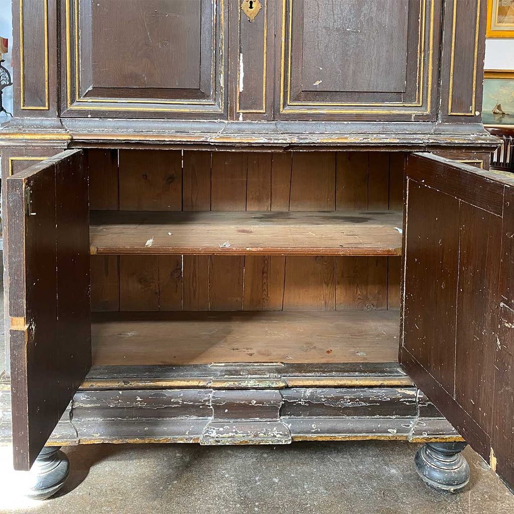 An antique Scandinavian Baroque two-part cupboard with four doors. Opens to interior with shelving.