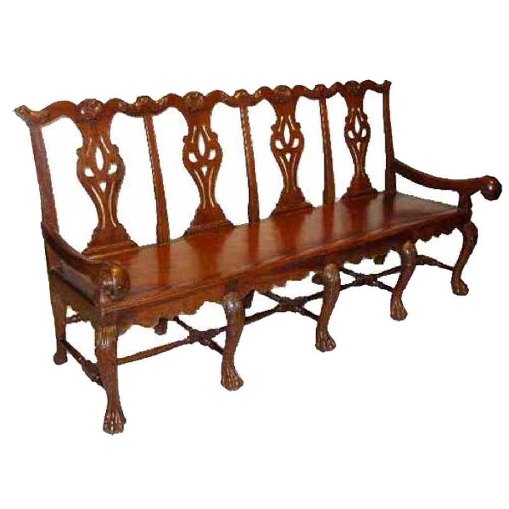 This large and beautiful, antique, 18th century, Anglo Indian bench was thoughtfully designed in a style of English Chippendale. It features floral carving on the top rail and pierced ribbon splats on the four seat backs. With scrolled arms and a nicely scalloped apron, the piece terminates on cabriole legs with nicely defined lion paw feet. Notice, also, the turned, repeated Height and raised back stretchers. It is an imposing and commodious settee.