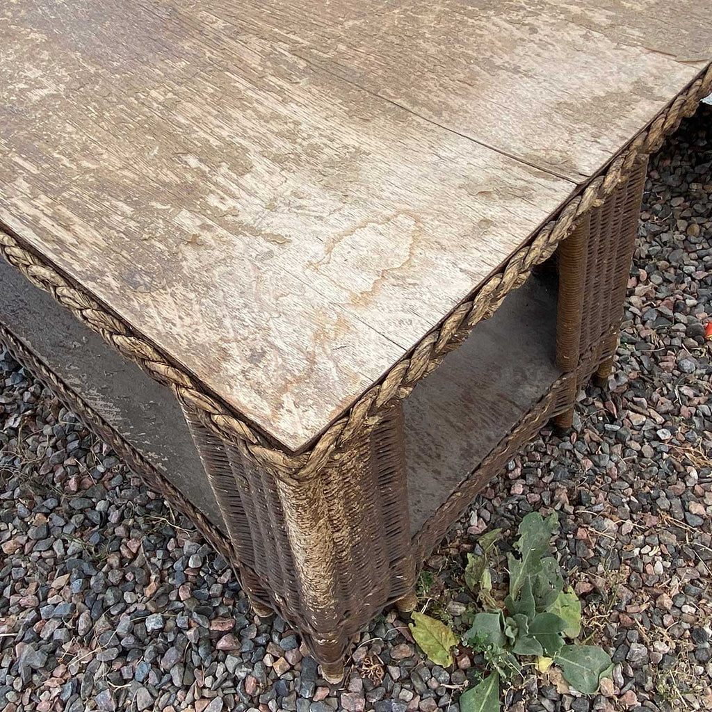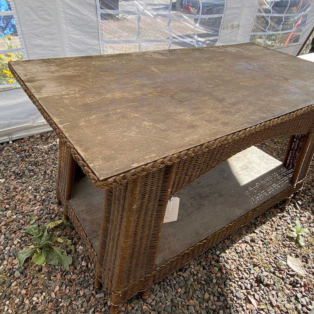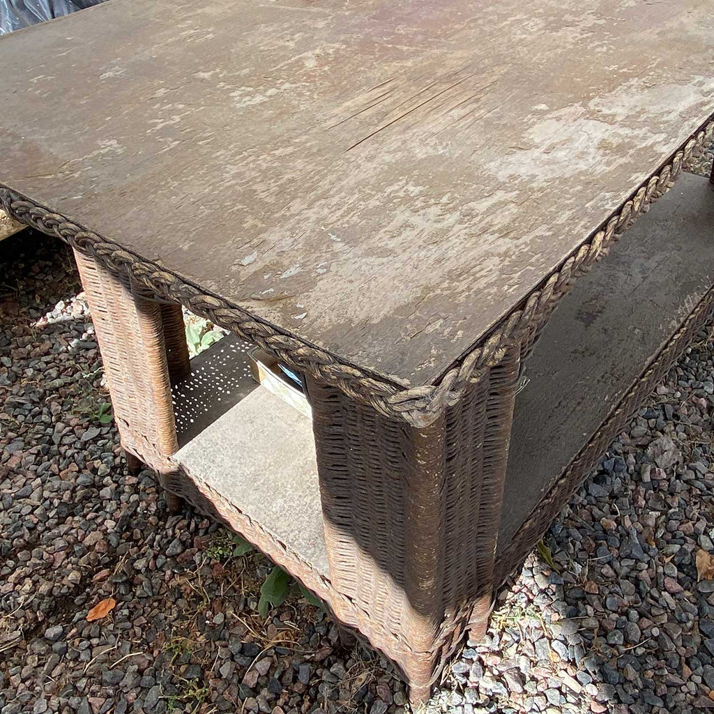 Vintage rectangular wicker table wth lower base shelf. Possibly designed by Stickley Brothers.