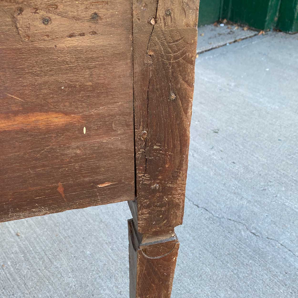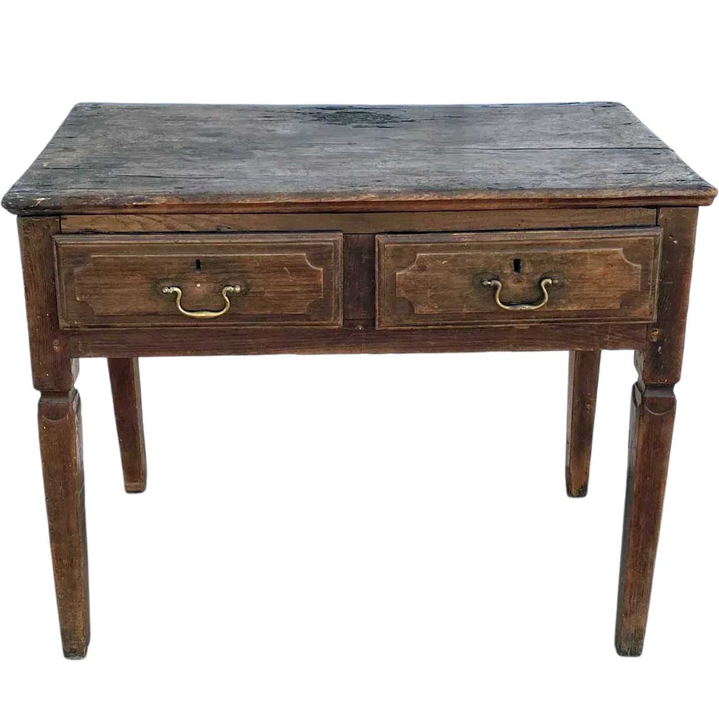 Hand crafted in a traditional manner, this antique provincial side table from Portugal lends a rustic note to any room. With thick rectangular, wide plank overhanging top. The double drawers feature raised panels with cut-back corners, and swan-neck brass pulls. Notice the notched and swag details at the tops of the four, tapered legs. This is a generously proportioned piece and will accommodate a good-sized lamp and accessories.