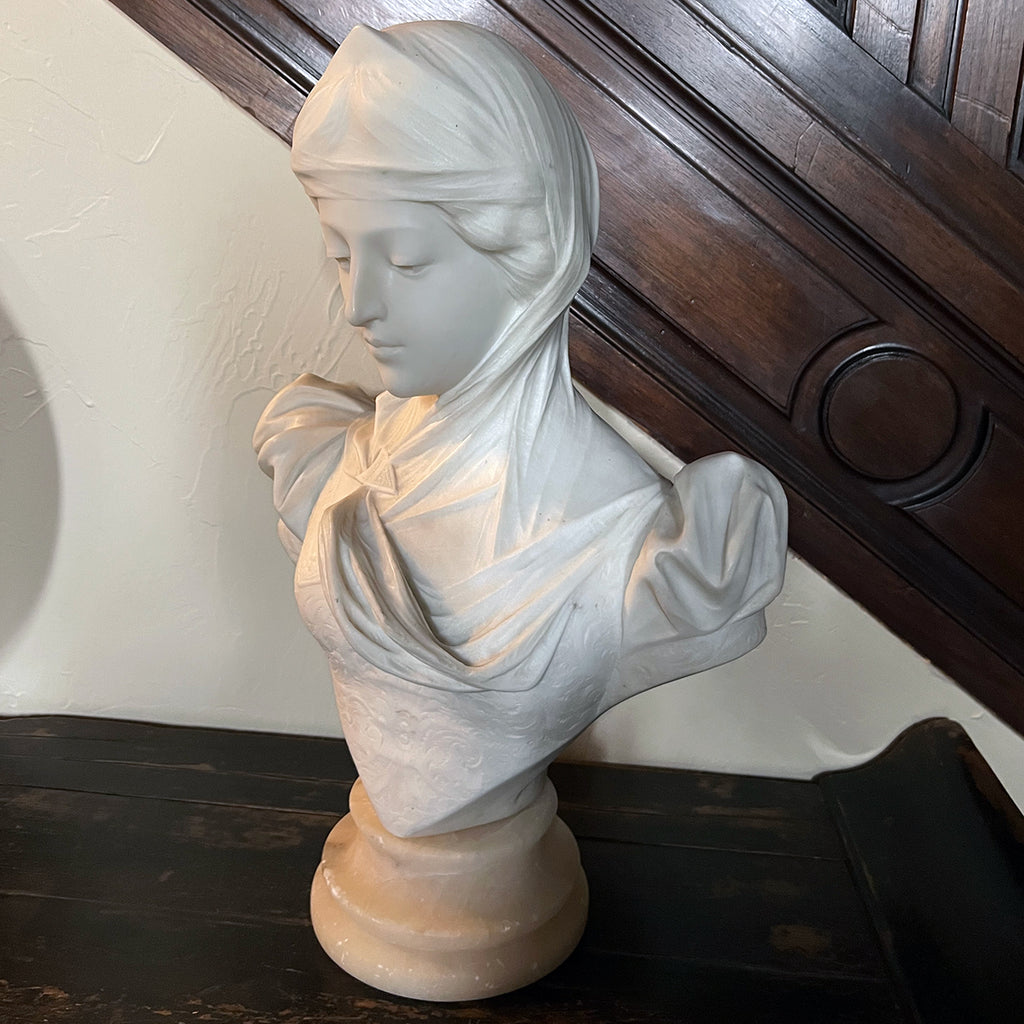 An antique alabaster head and shoulders bust of Dante's muse Beatrice, with her eyes cast serenely downwards.