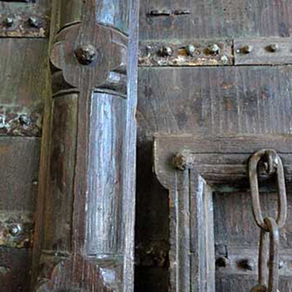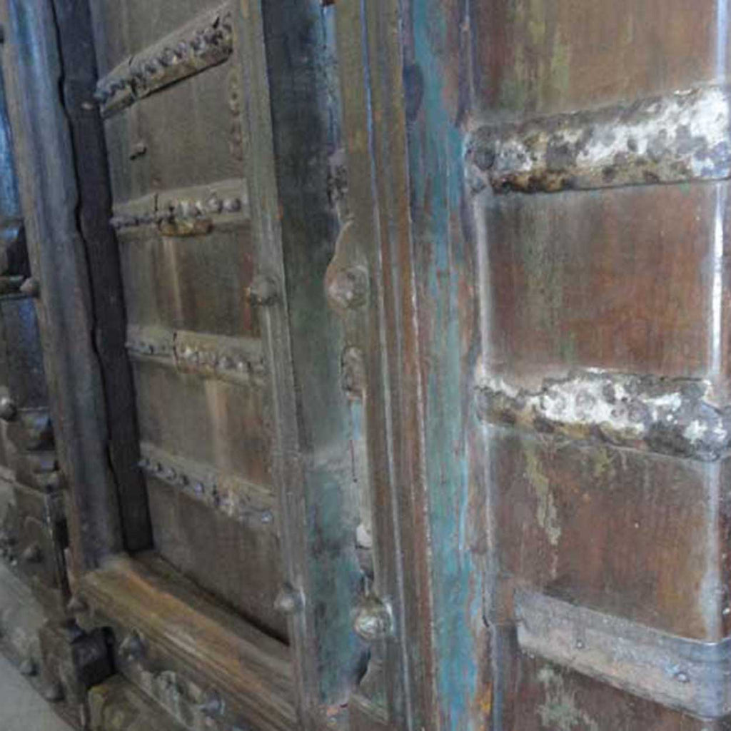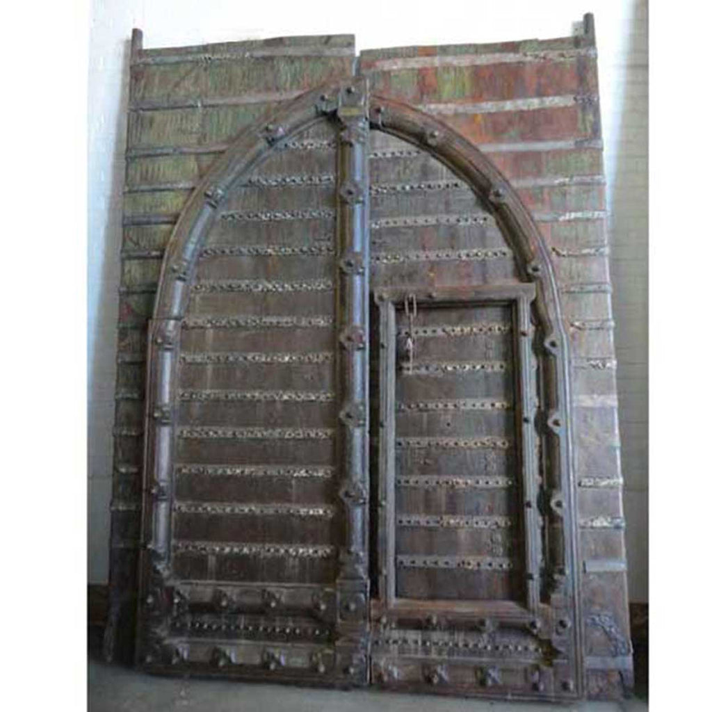 This massive, antique, Indian double door gate features an inset pedestrian door for ease of entry. Built for strength, they are crafted of thick teak with iron strapping, nail heads (clavos) and decorated with traditional thick, arched moldings and retains traces of old blue paint.