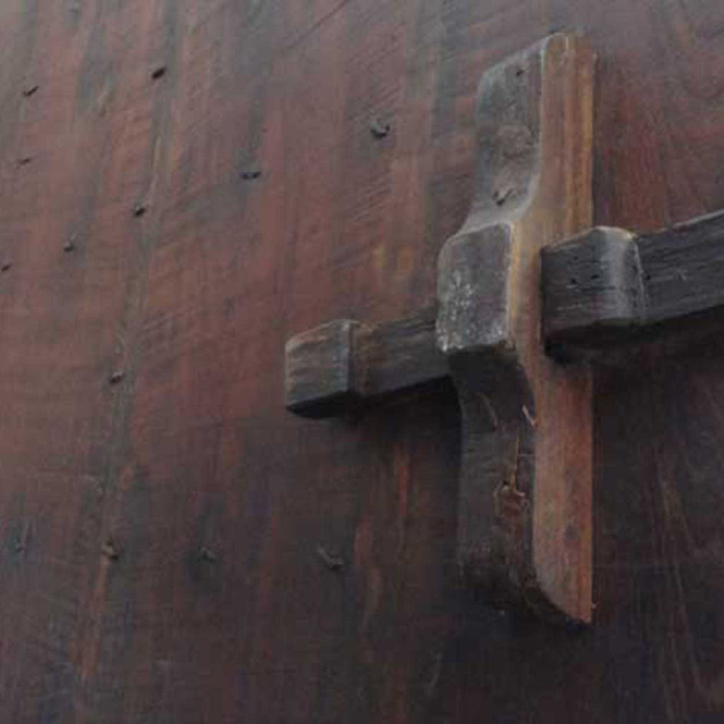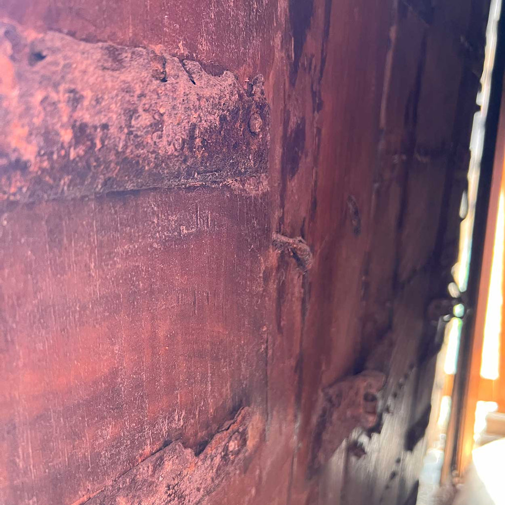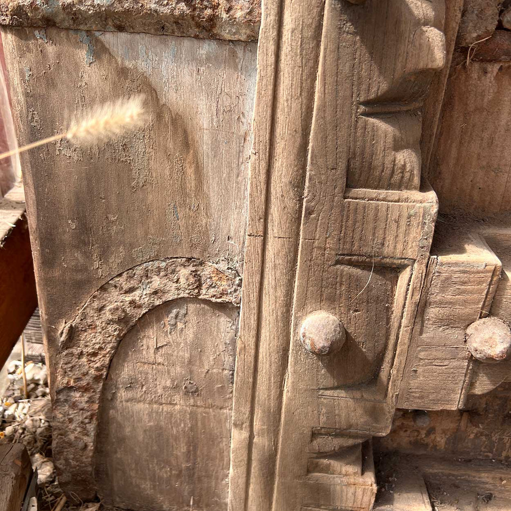 This massive, antique, Indian double door gate features an inset pedestrian door for ease of entry. Built for strength, they are crafted of thick teak with iron strapping, nail heads (clavos) and decorated with traditional thick, arched moldings and retains traces of old blue paint.