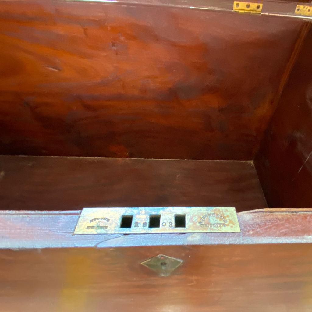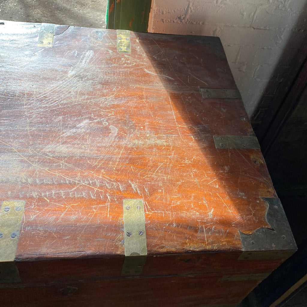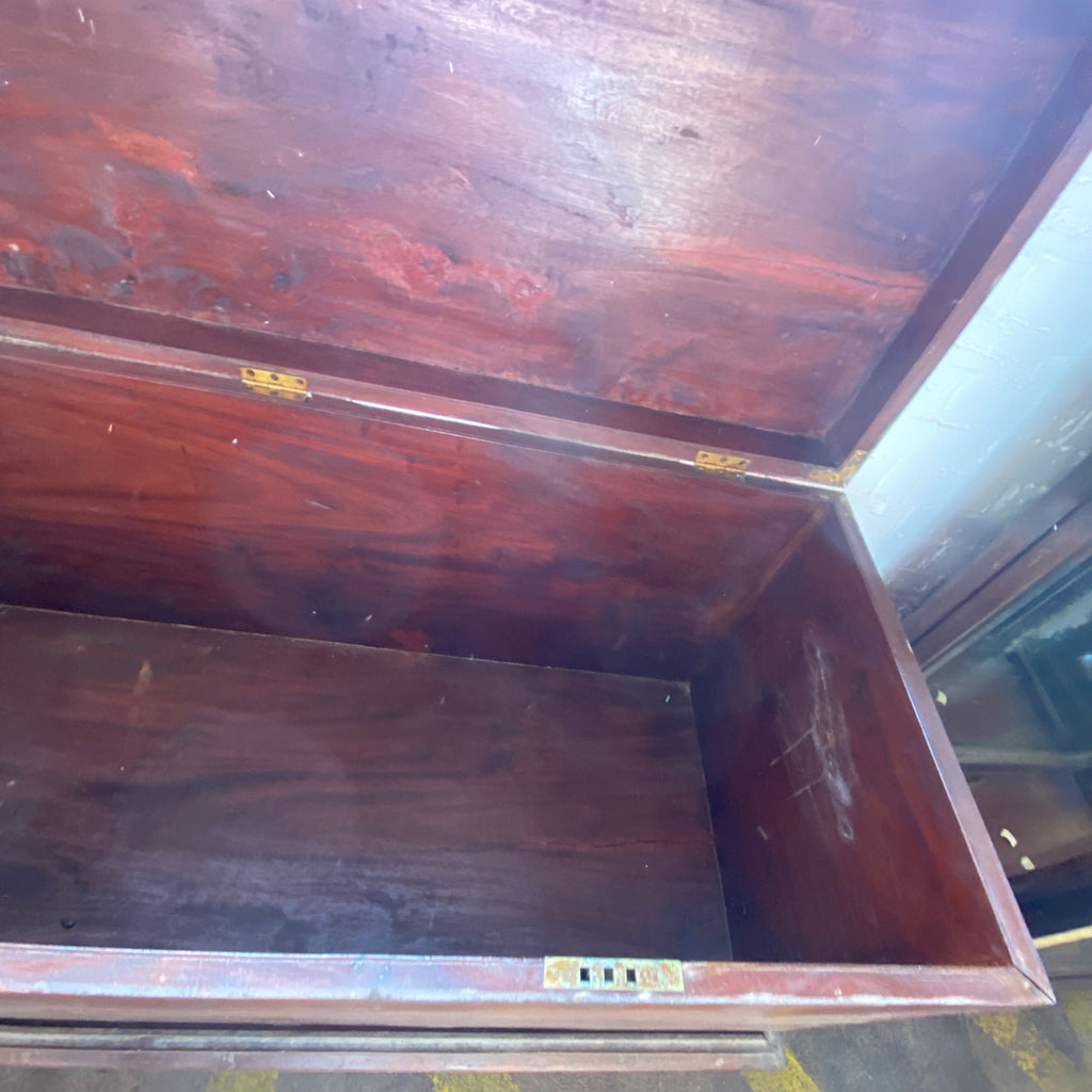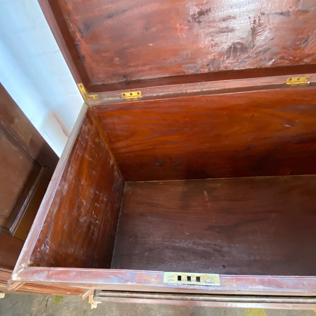 This very large, flat-topped, antique trunk features extensive brass reinforcements on the corners and edges, as well as heavy, brass side handles for carrying. It sits within a very fancifully executed base, with floral carving on the ogee apron, and French, scrolled feet. It most certainly will afford a new owner commodious storage space.