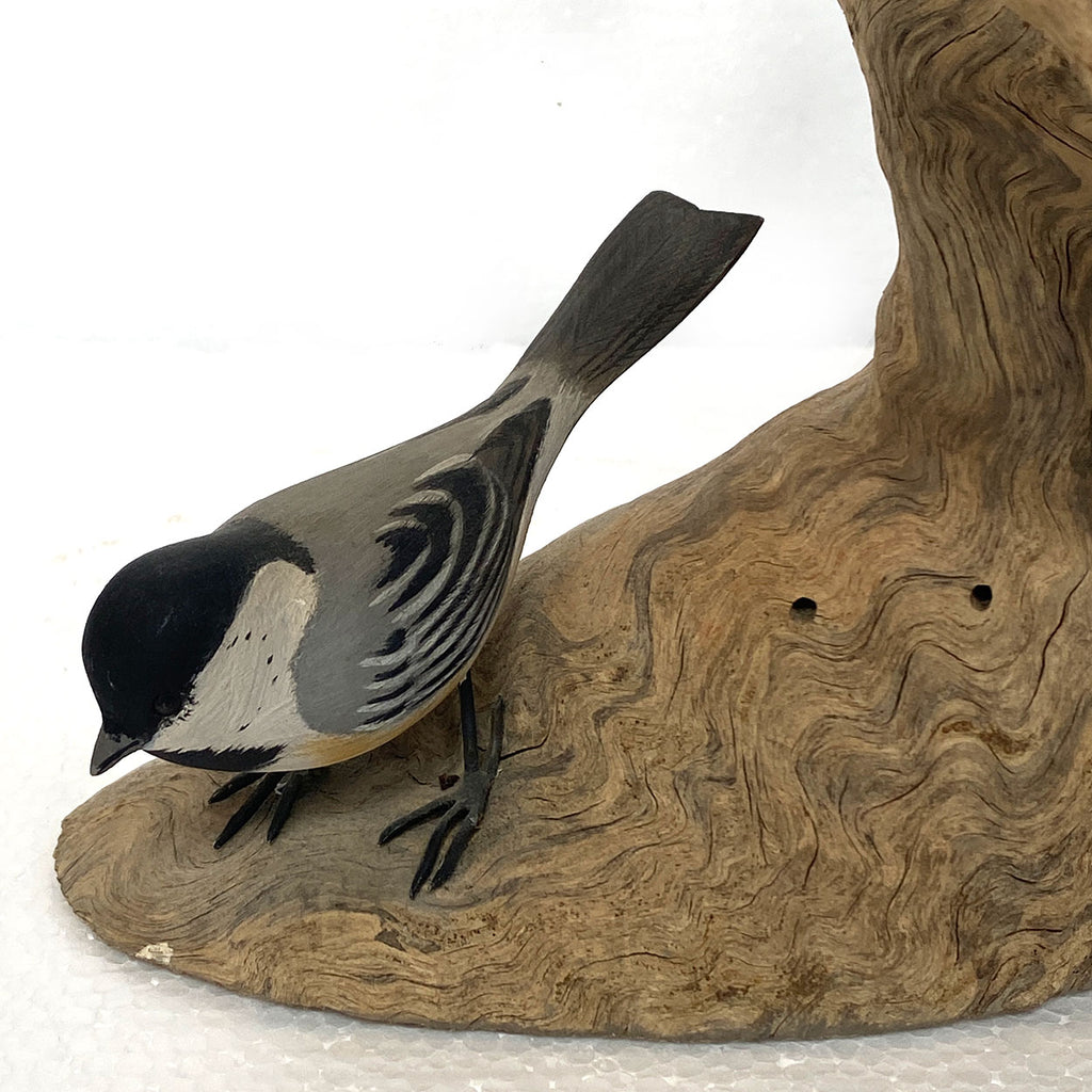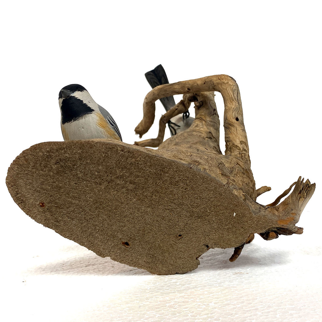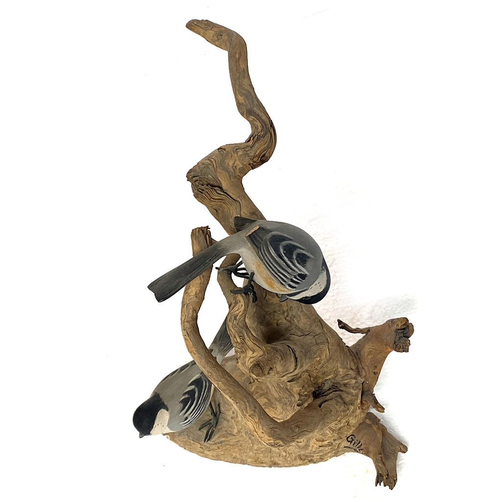 A vintage, hand carved, wooden, painted bird sculpture by noted New England bird carver Wendell Gilley. Modelled as two black-capped Chickadees perched on a piece of driftwood.