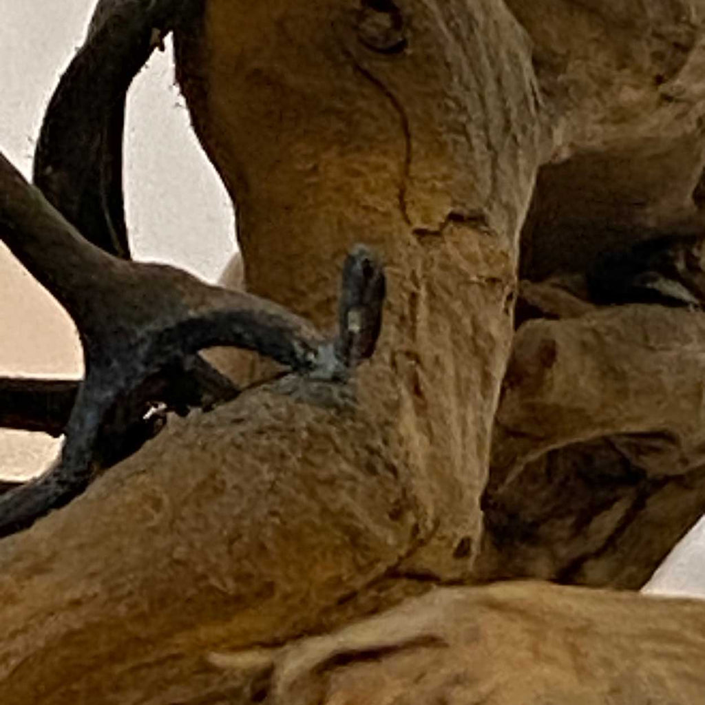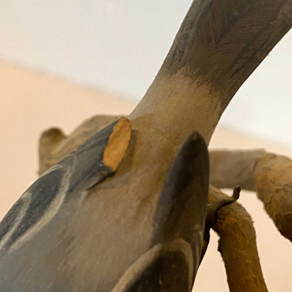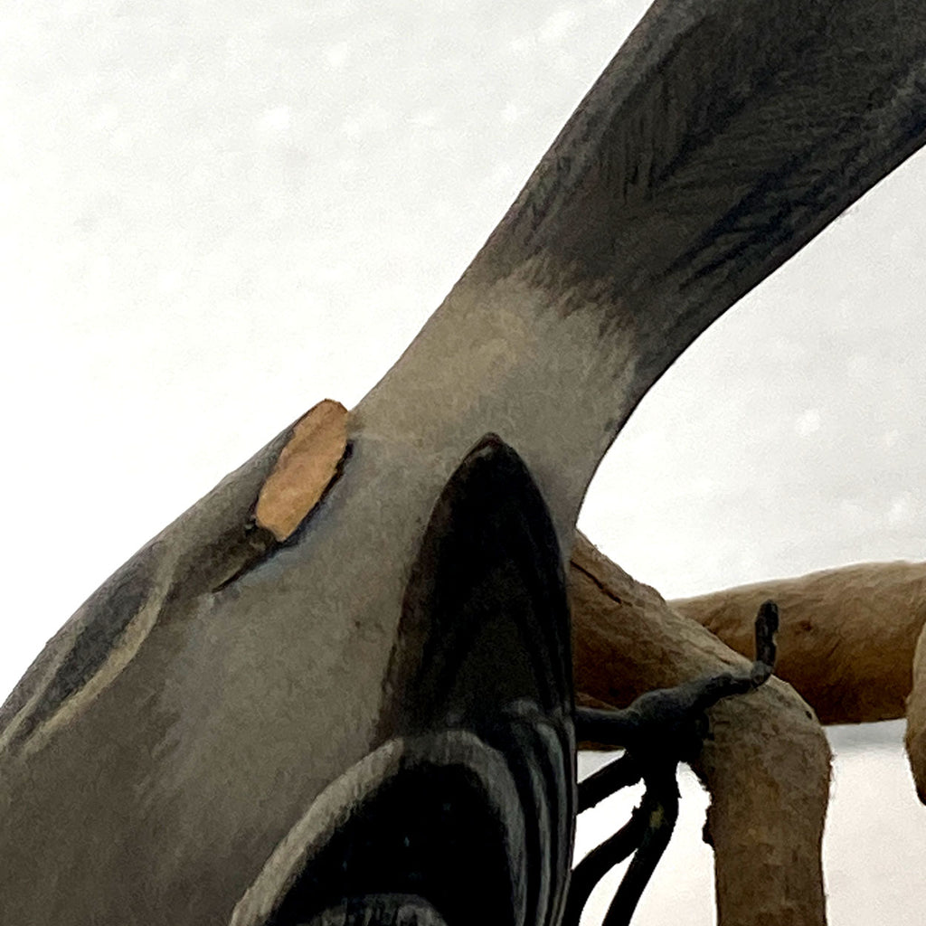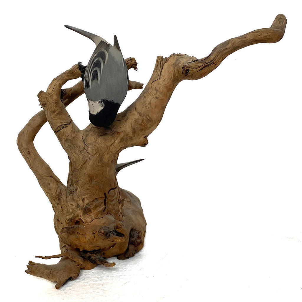 A vintage, hand carved, wooden, painted bird sculpture by noted New England bird carver Wendell Gilley. Modelled as two black-capped Chickadees perched on a piece of driftwood.
