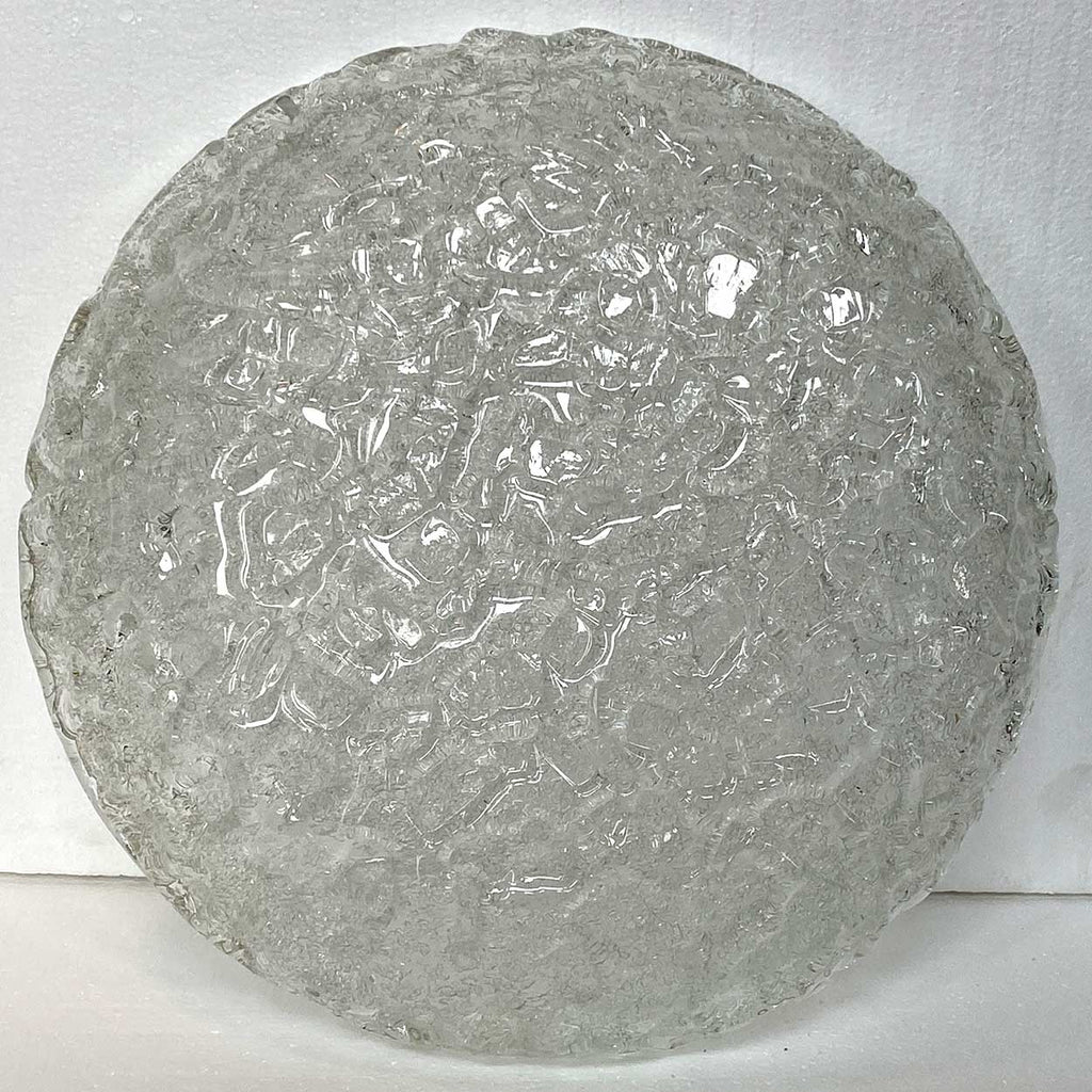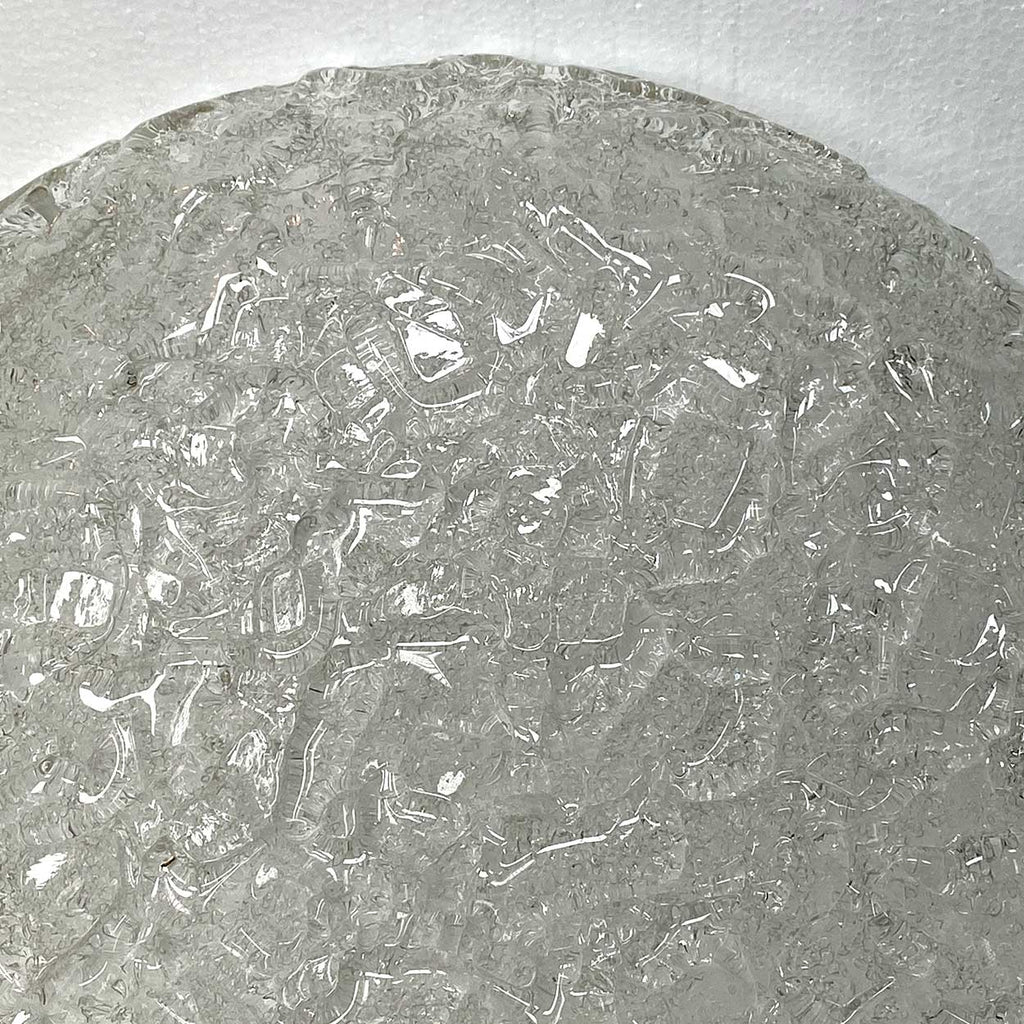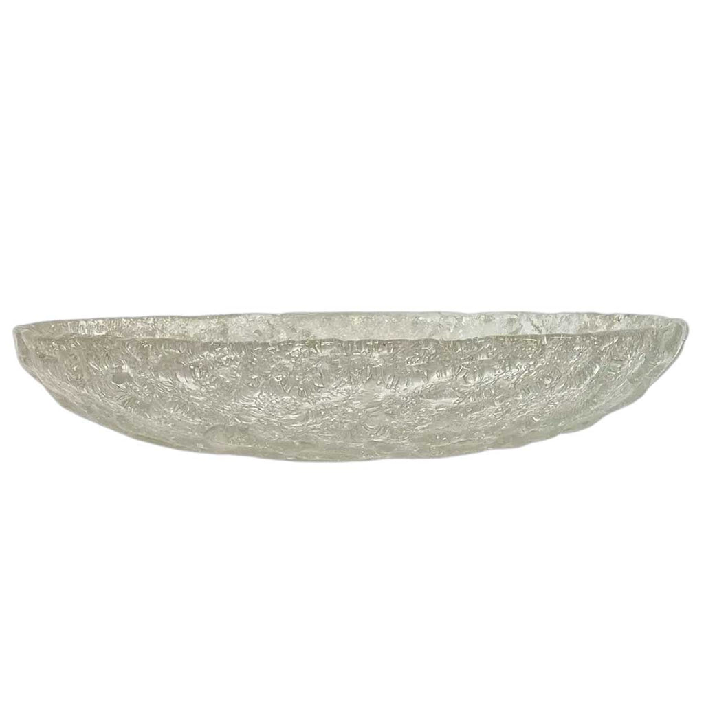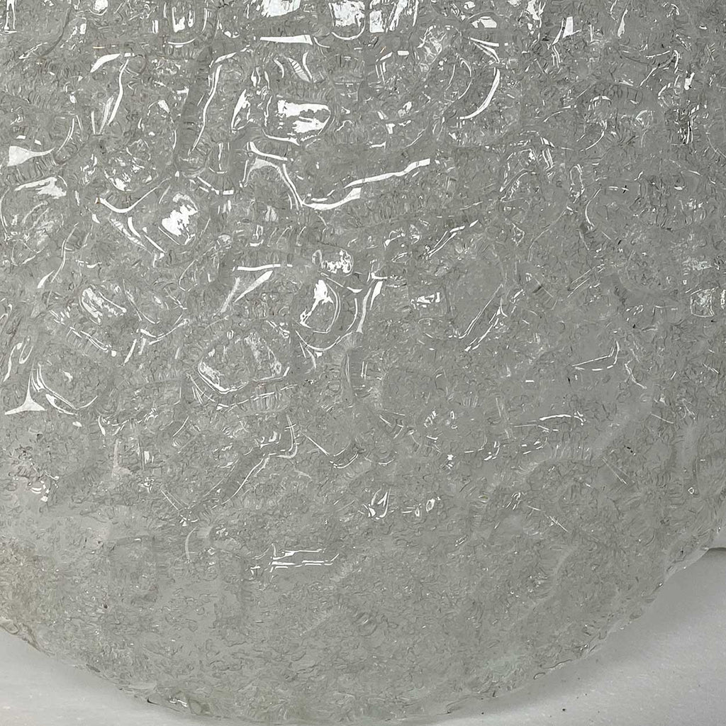 A vintage ceiling light or plafonnier with a brass canopy, chain and tubular stem supporting a heavily textured crackle glass, pale gold, bowl shade. This fixture is fitted with two light sockets. Probably designed by Carl Fagerlund (Swedish, 1915-2011), for