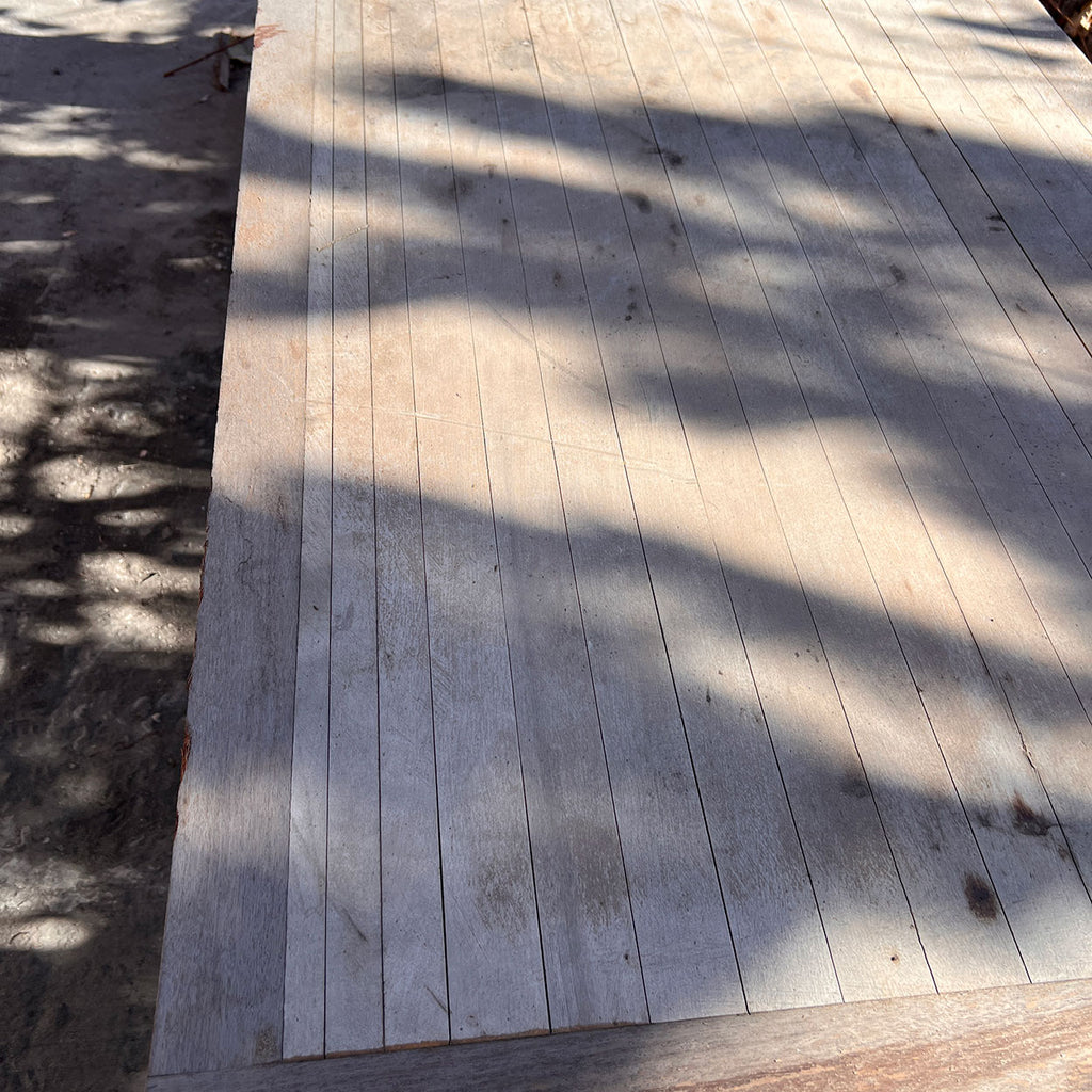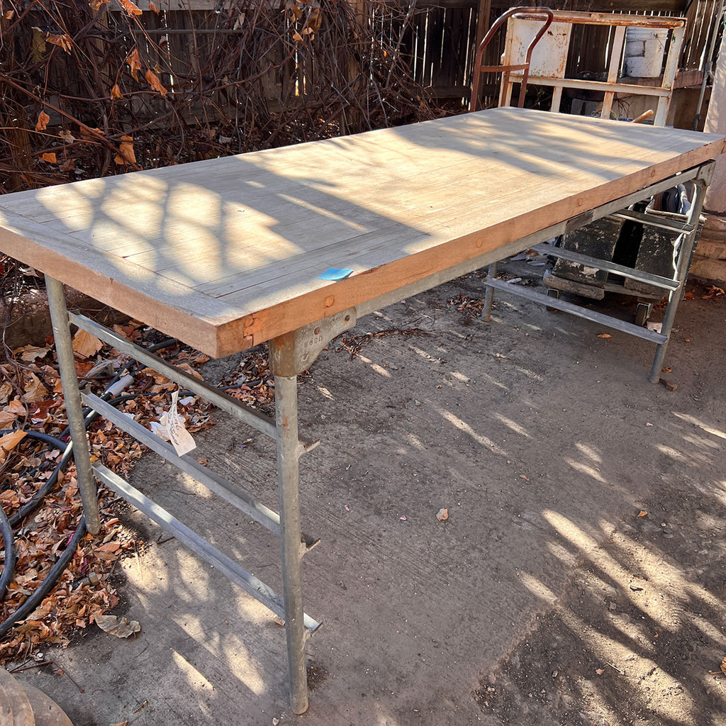 A vintage galvanized steel commercial bakery table with brackets for three lower shelves. The maple and mahogany top is a later addition and is made from old reclaimed, train boxcar flooring.