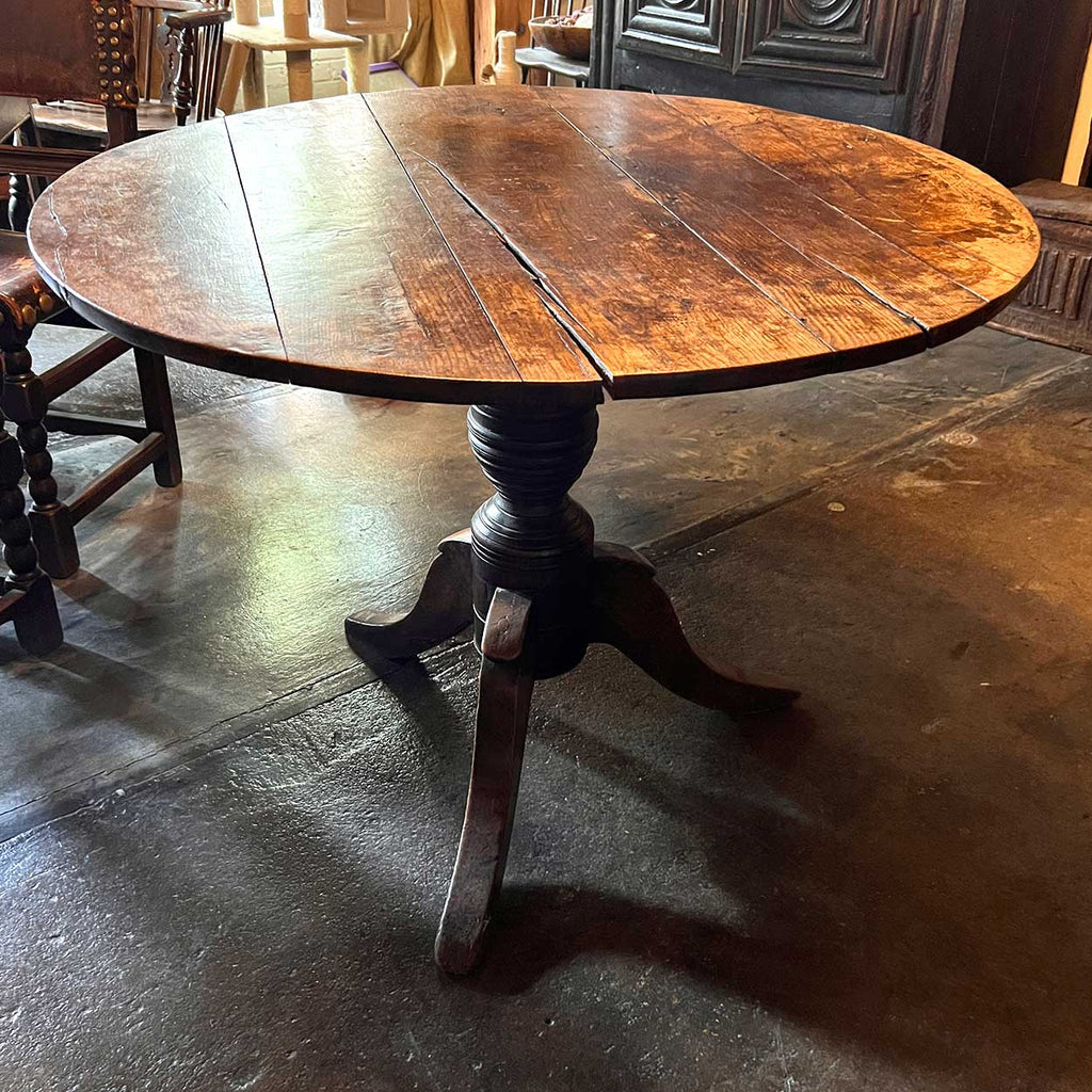 English Oak Plank Round Pedestal Tripod Tavern Table